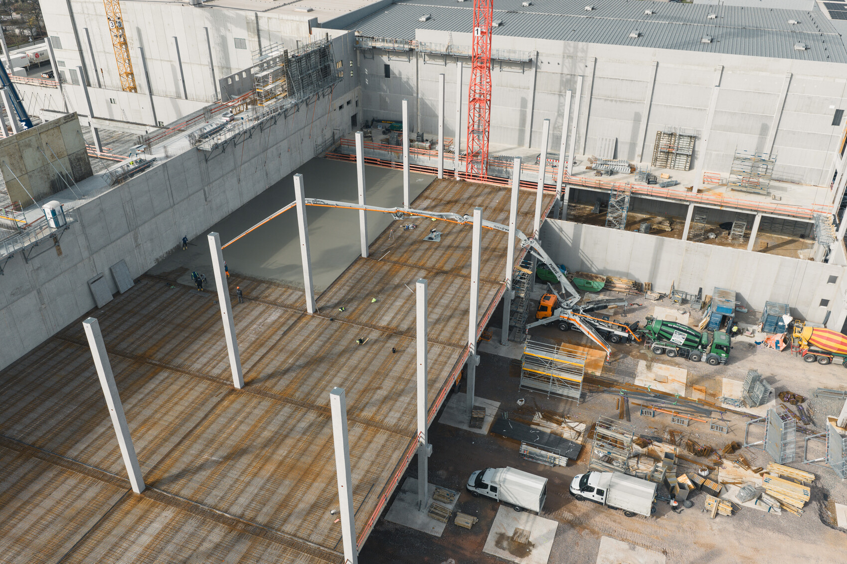 Was sich so einfach liest, ist in der Umsetzung eine logistische Meisterleistung: Der Beton trifft im Sekundentakt ein, wird über Hochdruckleitungen direkt an die richtige Stelle gepumpt, verteilt, abgezogen – und permanent kontrolliert. Kein Spielraum für Fehler, kein Zentimeter zu viel oder zu wenig.