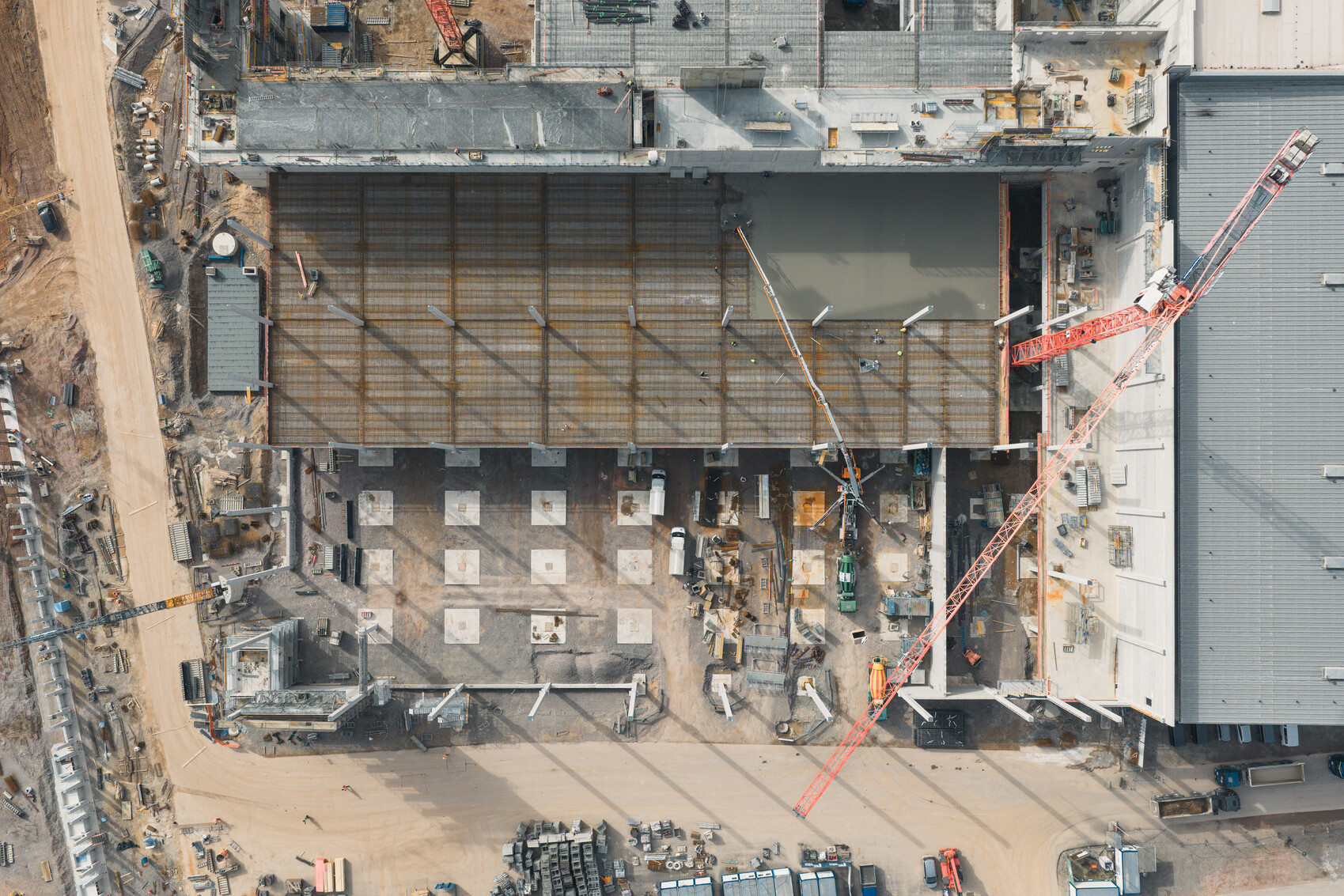 Was uns dabei besonders freut: Das Projekt nimmt immer mehr Gestalt an. Von den 140 Köcherfundamenten sind bereits 128 betoniert. Im Technikspine erreichen wir gerade Höhen von über 18 Metern: das Dach rückt näher. In der Versandhalle wachsen die Stützen, die Wände entstehen, die Streifenfundamente ziehen sich über 230 laufende Meter durch das Gelände. Und im nördlichen Bereich hat der Aushub für die Sprinklerzentrale begonnen.