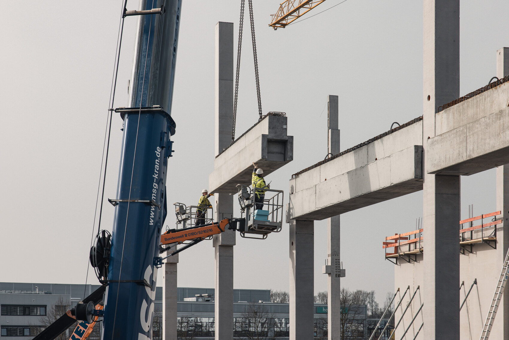 Aber das war nur ein Teil von dem, was auf der Baustelle gleichzeitig passiert. Während die Shuttle-Decke betoniert wird, werden an anderer Stelle Unterzüge für die nächsten PI-Plattendecken gesetzt, Ankerplatten für Kragträger geschweißt, Fundamente vorbereitet. Bis zu 40 Gewerke arbeiten parallel: perfekt von uns koordiniert.