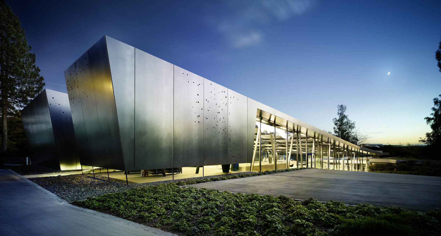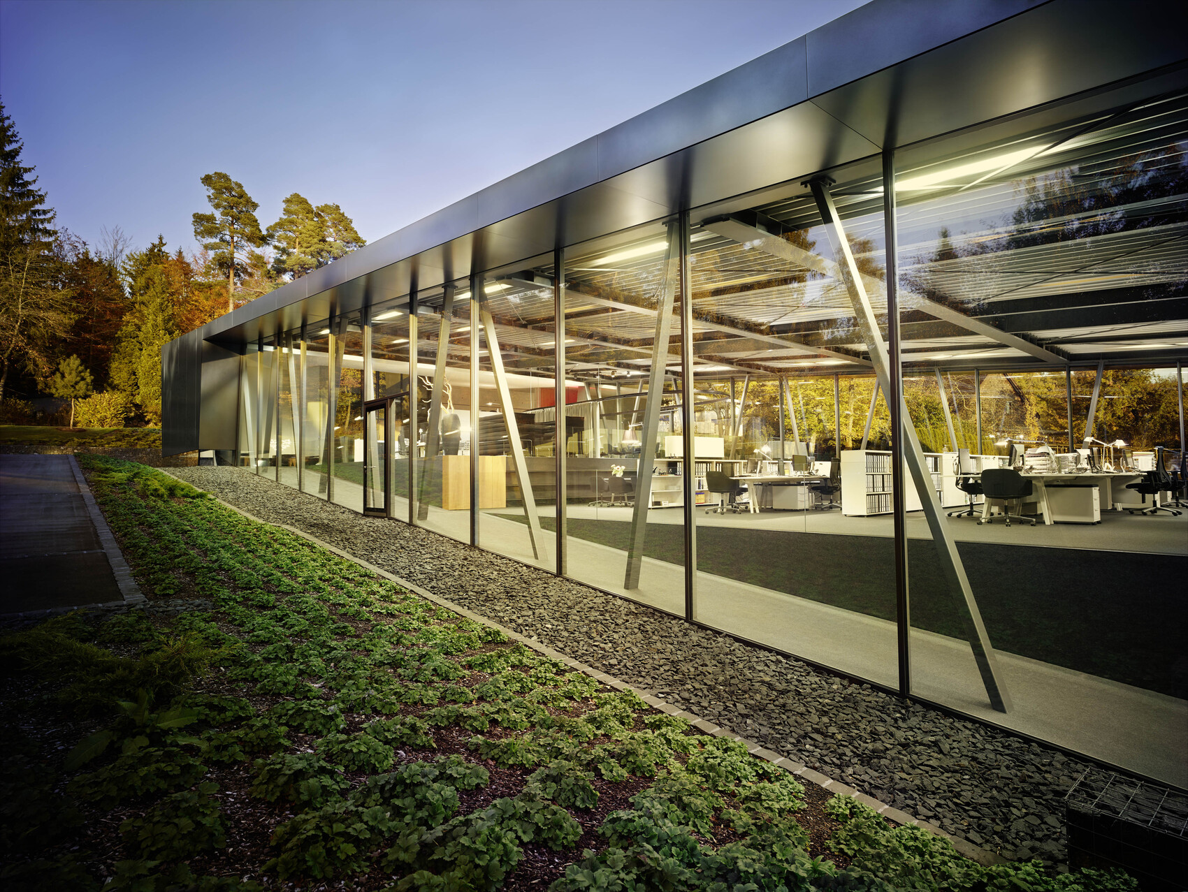 2012 entstand das Open Space Office – das Herz des Campus. Ein flacher Baukörper, der sich in die Hanglage einfügt, Innen- und Außenraum verschmelzen lässt und durch großzügige Verglasungen Licht und Landschaft integriert.