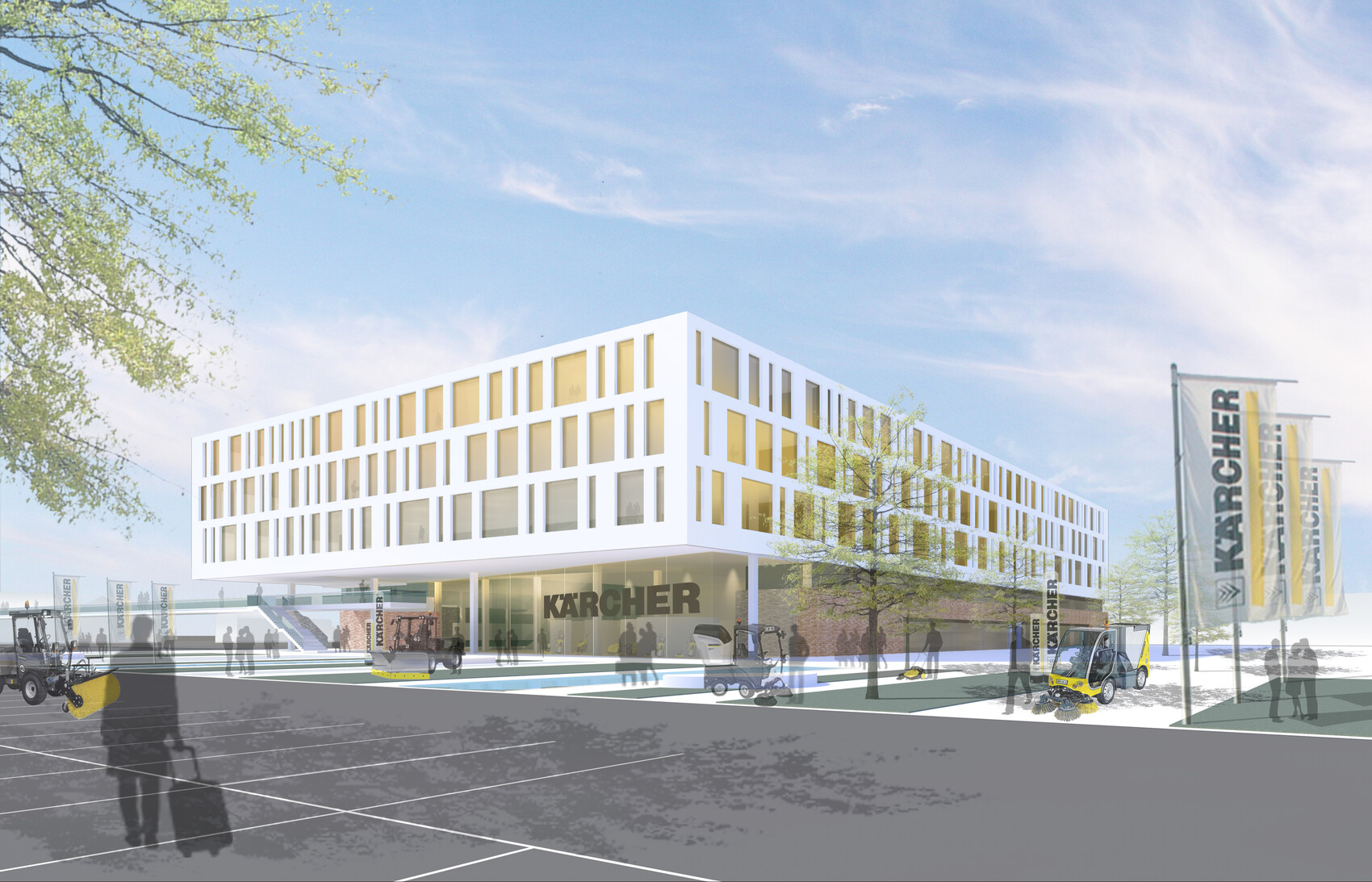 Im Rahmen des Wettbewerbs für das Kundencenter am Kärcher-Standort Winnenden entwickelte S+P ein klar gegliedertes Gebäude- und Erschließungskonzept, das Besucherbereiche, Mitarbeiterfunktionen und Anlieferung eindeutig trennt und zugleich funktional miteinander verknüpft. Präsentation, Showroom und Empfang sind im Erdgeschoss angeordnet und direkt mit einem verkehrsberuhigten Vorplatz verbunden. Die Verwaltungs- und Arbeitsbereiche gruppieren sich um belichtete Innenhöfe und ermöglichen flexible Nutzungen sowie eine hohe Aufenthaltsqualität. Die modulare Struktur des Entwurfs schafft zudem die Grundlage für zukünftige Erweiterungen und veränderte Anforderungen.