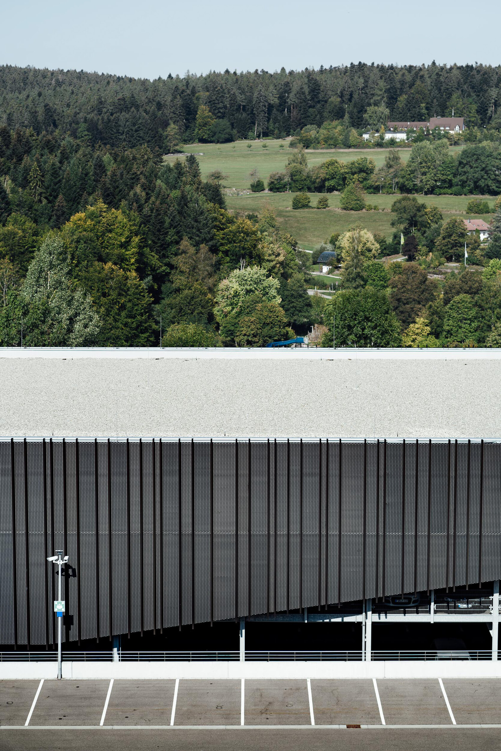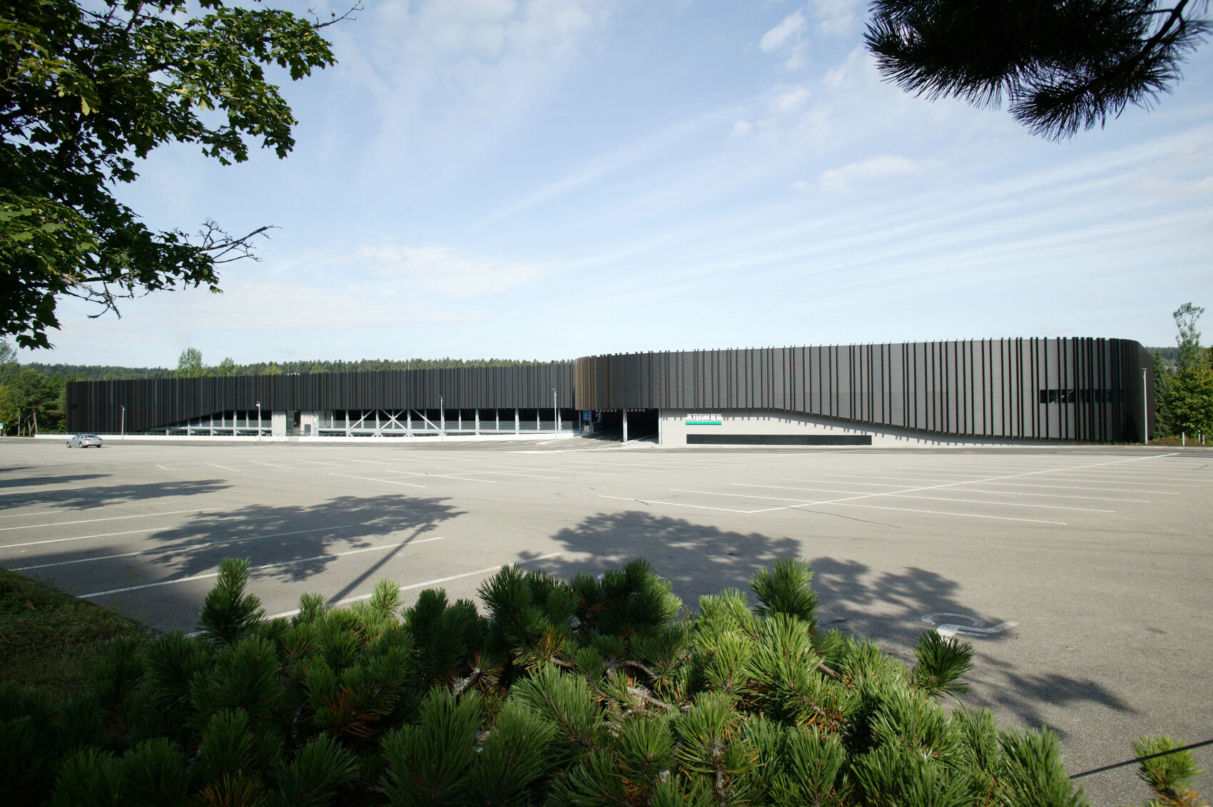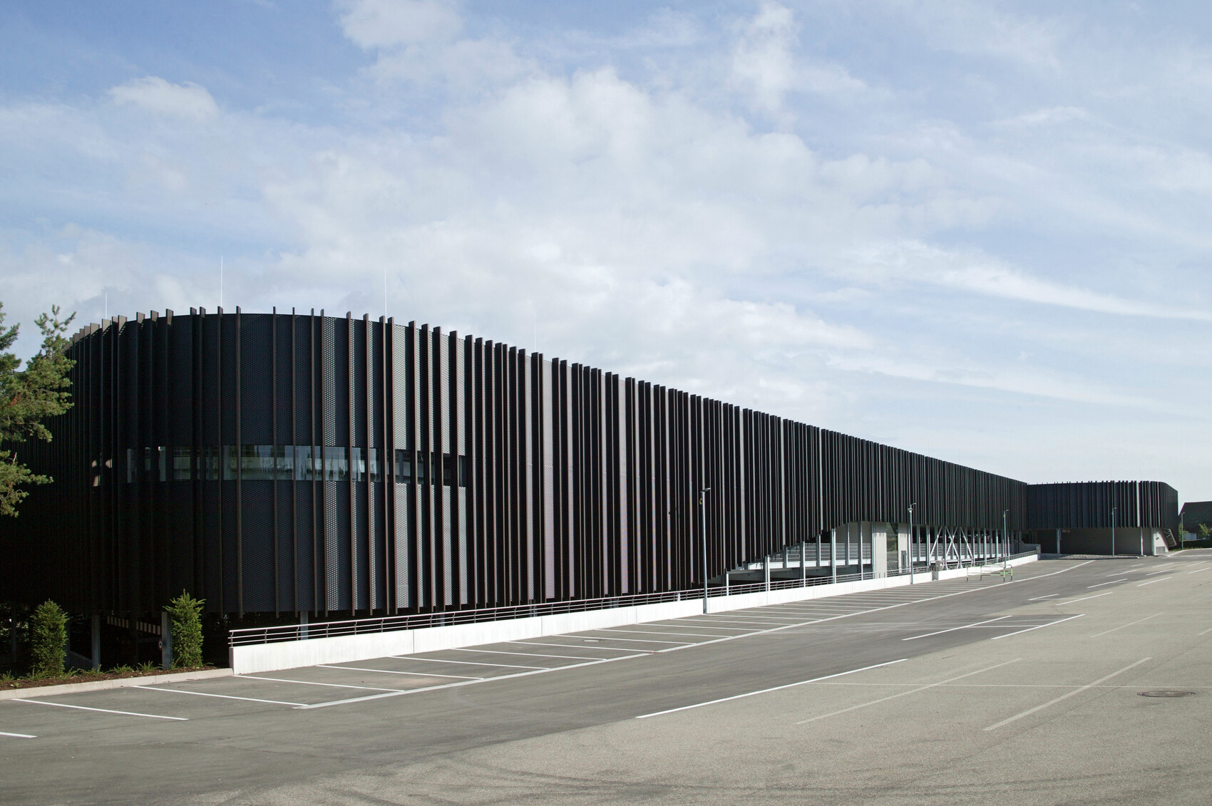 Damit das Gebäude in Symbiose zu der umgebenden Landschaft tritt, wurde eine dunkel eloxierte Lamellen- und Streckmetallfassade gewählt. Die Lamellen bilden nach oben und unten unscharfe Kanten und lassen aus unterschiedlichem Blickwinkel differente Strukturen erscheinen. Aufgrund des Schichtbetriebs ist das Parkhaus auch nachts zwischen 22.00 Uhr und 06.00 Uhr in Betrieb. Dies erforderte eine gegen Schallimmission schützende Fassade, ebenfalls mussten die notwendigen freien Entrauchungsquerschnitte erreicht werden. Zusätzlich wurde die Fassade außen schallabsorbierend ausgebildet, sodass keine Schallreflexion zu den Nachbarn entsteht.