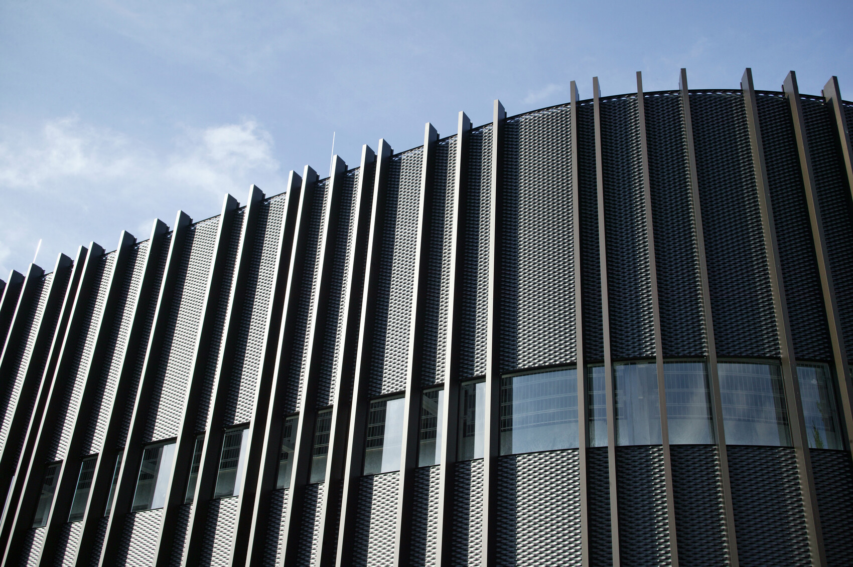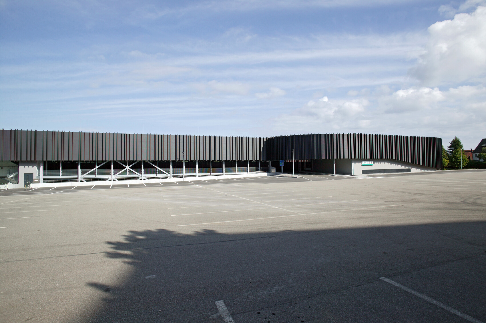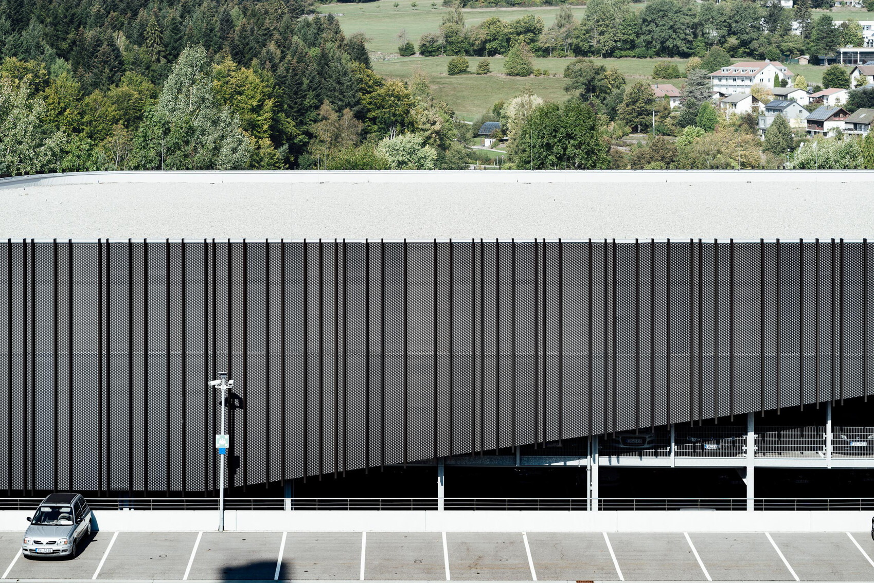 Damit das Gebäude in Symbiose zu der umgebenden Landschaft tritt, wurde eine dunkel eloxierte Lamellen- und Streckmetallfassade gewählt. Die Lamellen bilden nach oben und unten unscharfe Kanten und lassen aus unterschiedlichem Blickwinkel differente Strukturen erscheinen. Aufgrund des Schichtbetriebs ist das Parkhaus auch nachts zwischen 22.00 Uhr und 06.00 Uhr in Betrieb. Dies erforderte eine gegen Schallimmission schützende Fassade, ebenfalls mussten die notwendigen freien Entrauchungsquerschnitte erreicht werden. Zusätzlich wurde die Fassade außen schallabsorbierend ausgebildet, sodass keine Schallreflexion zu den Nachbarn entsteht.