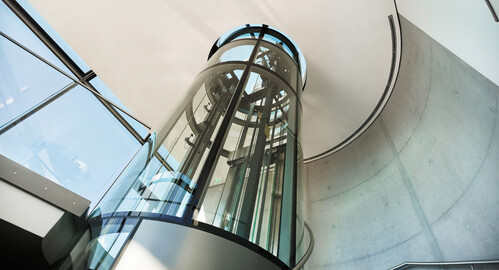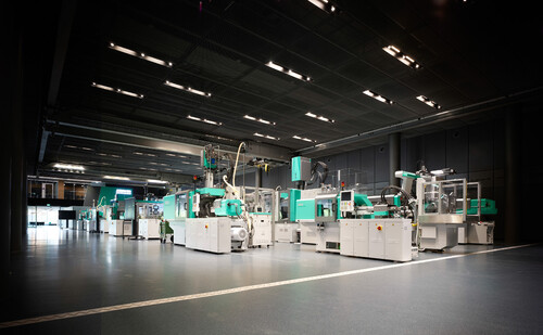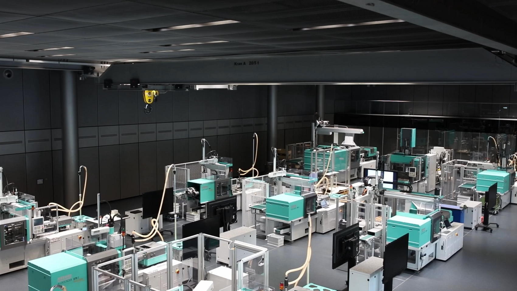 Das Herzstück des Schulungscenters bildet die 1.200 m² große Maschinenhalle im Erdgeschoss. Dort stehen 15 voll funktionsfähige ALLROUNDER Spritzgießmaschinen aller Baugrößen und Antriebsarten bereit – ausgestattet mit Robot-Systemen, IoT-Gateways sowie einer Anbindung an das Arburg Leitrechnersystem. Ergänzt wird das Angebot durch einen ARBURG Freeformer für Schulungen in der additiven Fertigung. Die Maschinenhalle ist durch eine Innenverglasung vom restlichen Erdgeschoss getrennt und verfügt über eine Hängekrananlage, die im Tandembetrieb bis zu 40 t bewegt. Eine Spannbetonkonstruktion ermöglicht die stützenfreie Weite der Halle.