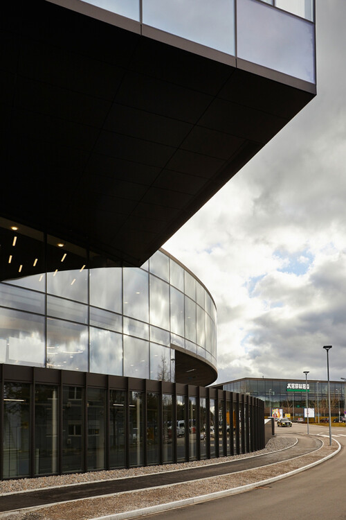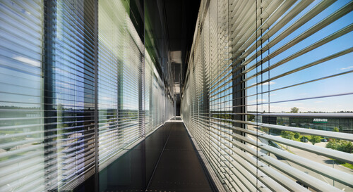 Die Aussenhülle besteht aus einer großflächigen Glas-Doppelfassade mit insgesamt etwa 7.200 m² Glasfläche (inklusive Aluminiumverkleidung)