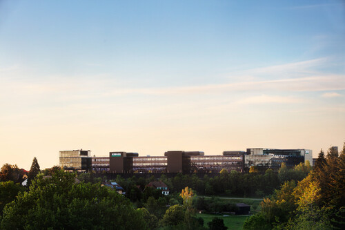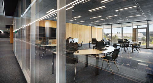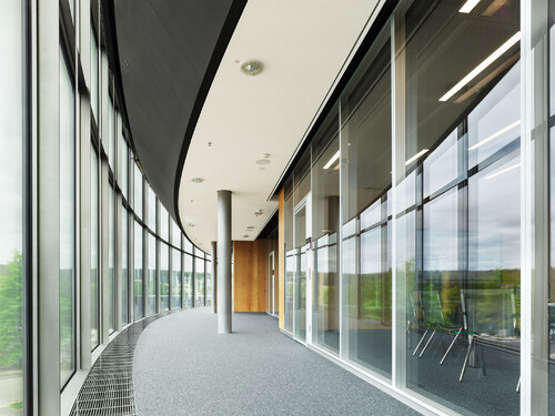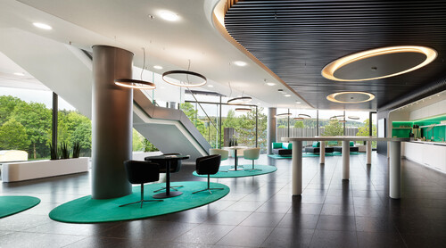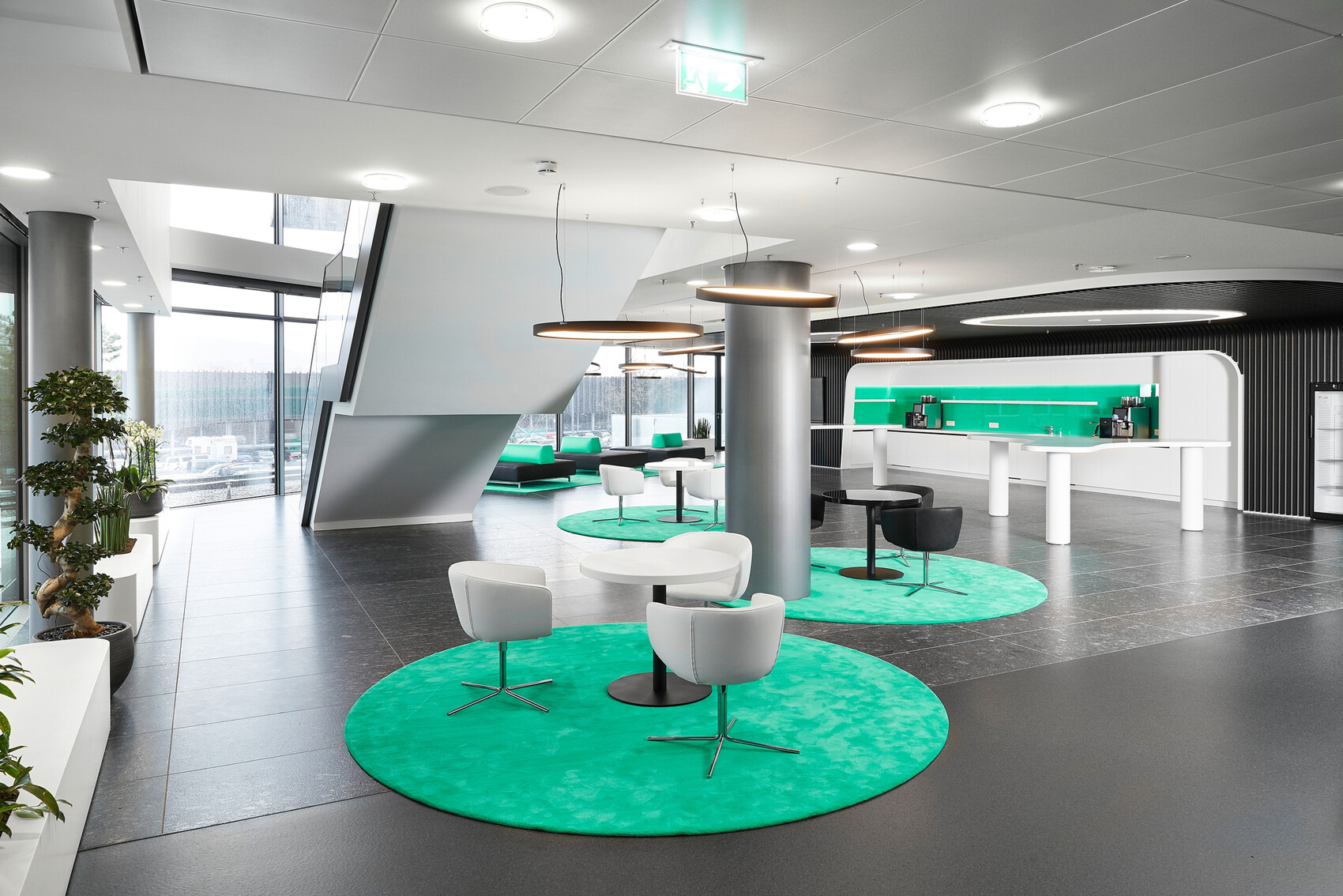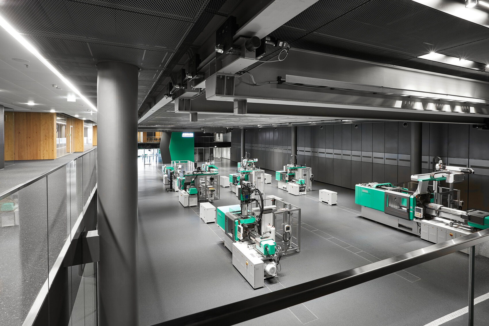 Für die Kundenschulung stehen im Erdgeschoss und 1. Obergeschoss insgesamt 2.200 m² bereit, davon 1.200 m² im Erdgeschoss für bis zu 15 Spritzgießmaschinen. Zwölf Schulungsräume ermöglichen eine praxisnahe und theoretische Ausbildung für über 150 gleichzeitige Teilnehmer. Darüber hinaus sind in den daran anschließenden beiden Geschossen moderne Großraumbüros mit jeweils 160 Arbeitsplätzen entstanden.