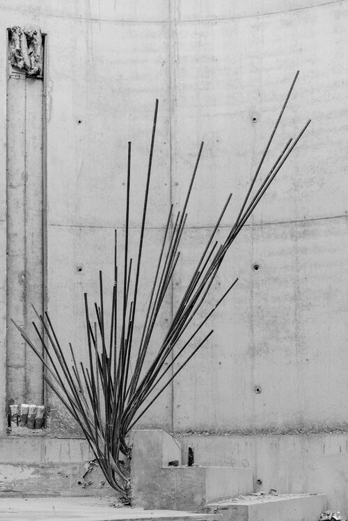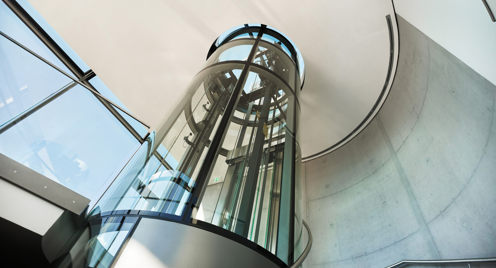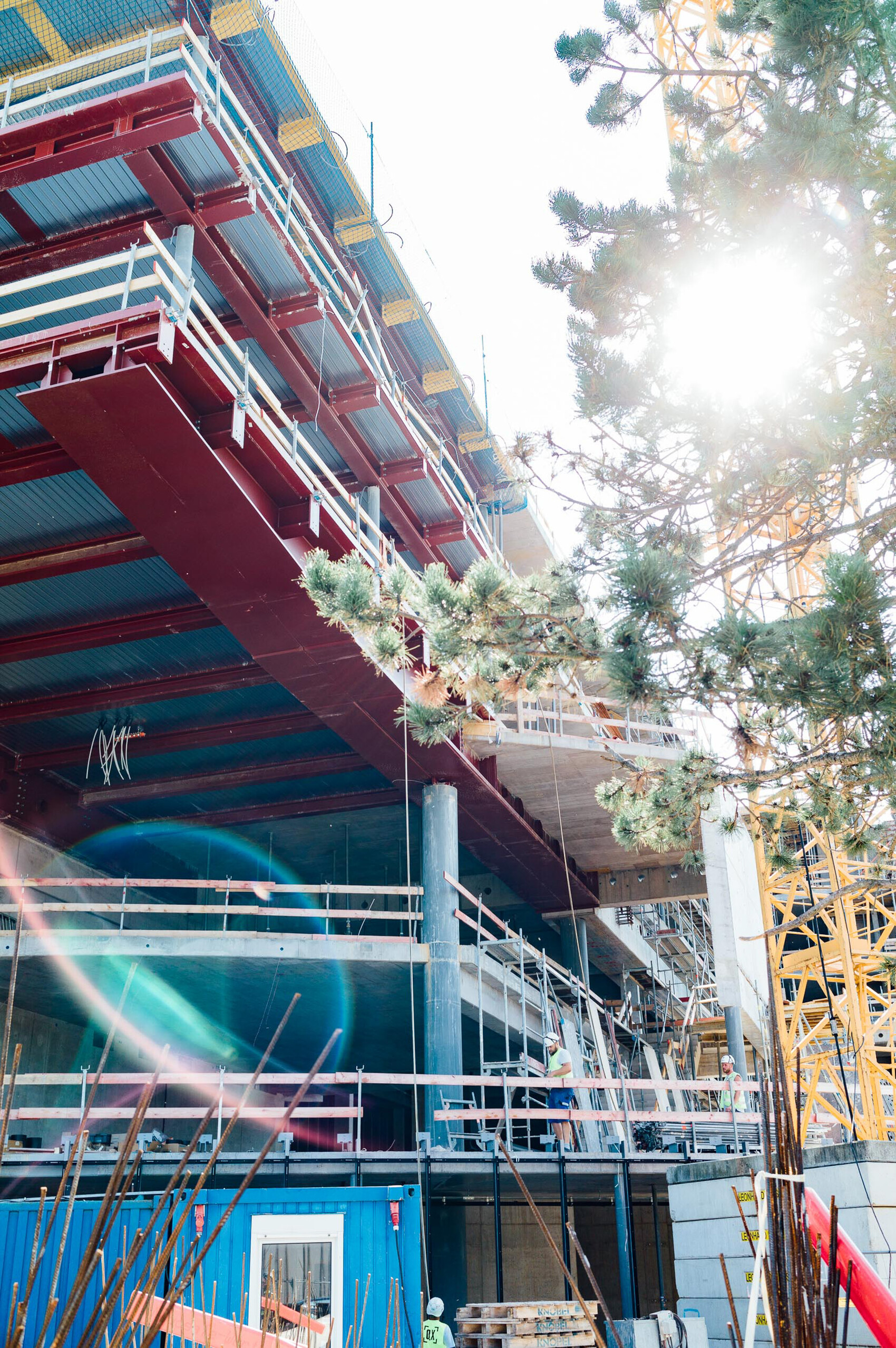 Ein markantes Merkmal ist die freitragende Auskragung: Ab dem zweiten Obergeschoss schwebt ein Teil des Gebäudes — teilweise bis zu 13 Meter über die Straße (Arthur-Hehl-Straße) hinaus. Für diese Auskragung wurden massive Doppel-Stahlträger eingesetzt: jeweils ca. 1,80 m hoch und breit, 25 m lang, mit einem Gewicht von rund 79 Tonnen — vergleichbar mit massiven Betonträgern, jedoch deutlich leichter.