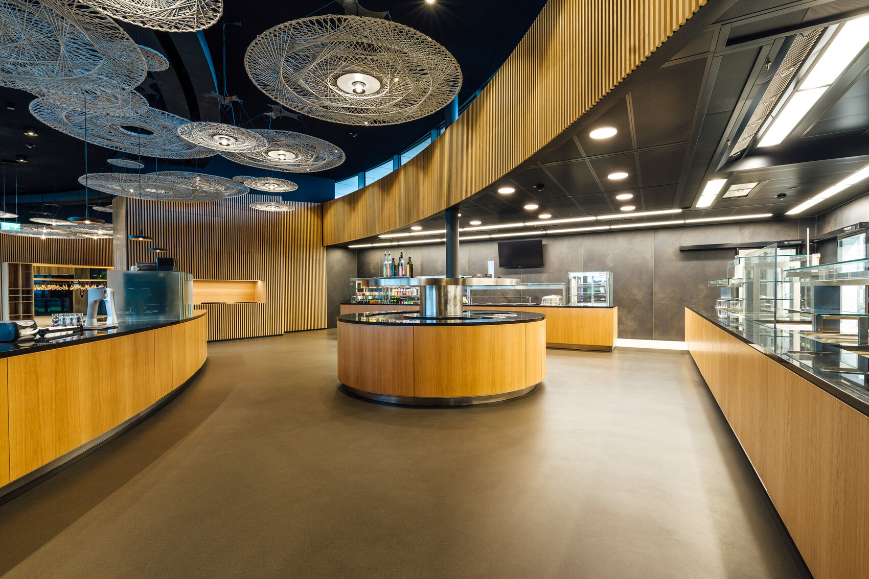 Das Betriebsrestaurant versteht sich dabei nicht als reiner Funktionsbau, sondern als sozialer Mittelpunkt. Offen, lichtdurchflutet und klar strukturiert bietet es Raum für Austausch, Begegnung und Pause – für Mitarbeitende ebenso wie für Gäste. Materialien, Farben und Details greifen das übergeordnete Gestaltungskonzept auf und führen es atmosphärisch weiter.
