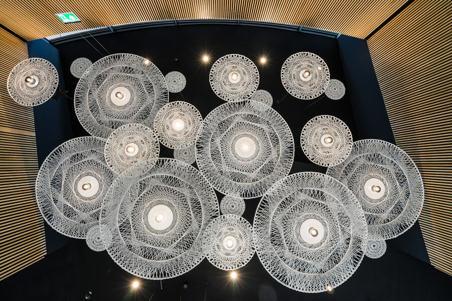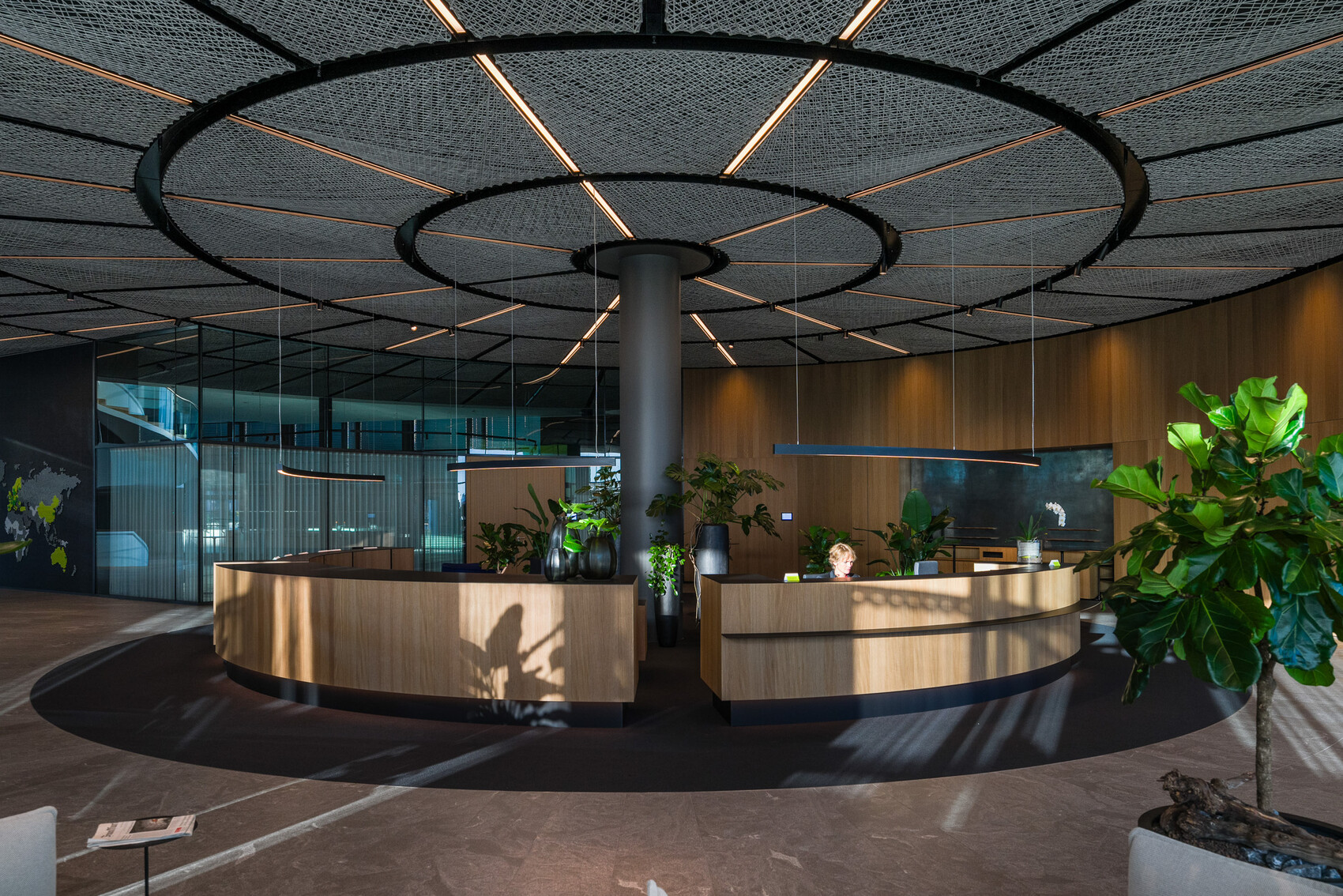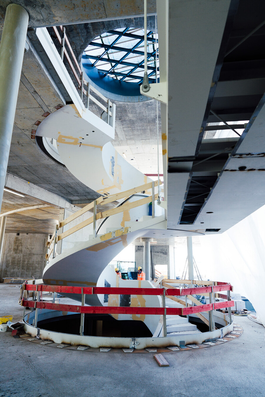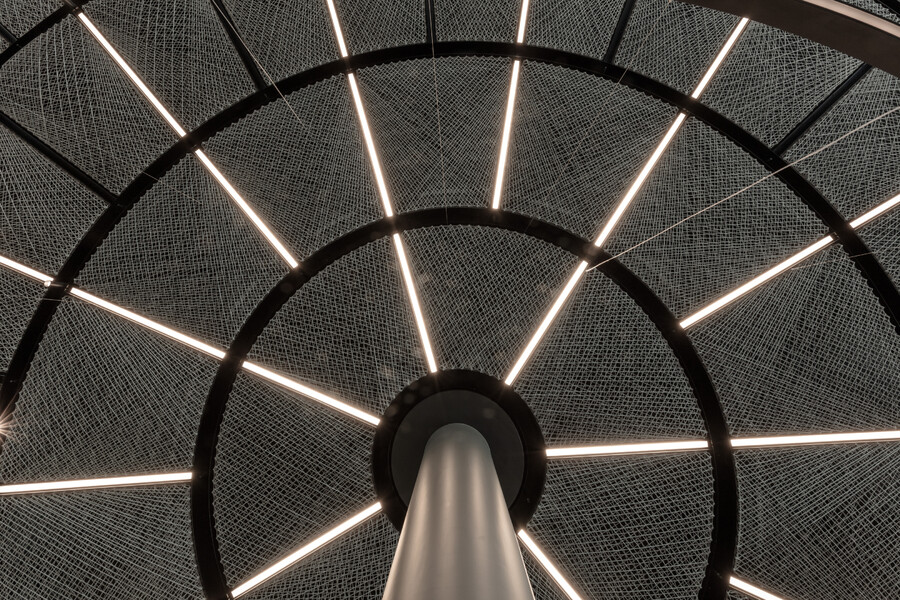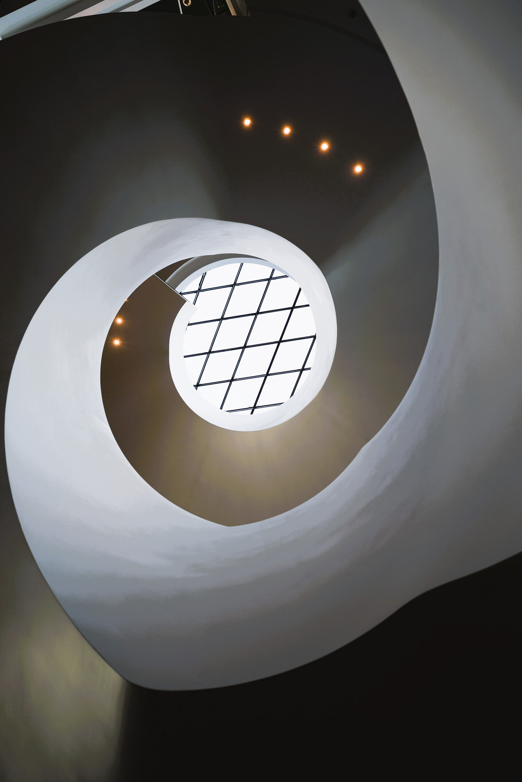Im aktuellsten Bauabschnitt am Stammsitz in Rosenfeld verdichtet sich diese Idee. Das neue Kundencenter mit Empfang und Verwaltung, das Betriebsrestaurant „S’RÄDLE“ und das Testzentrum übersetzen das Produkt „Rad“ erstmals konsequent in Architektur. Die runde Gebäudestruktur, radiale Möblierung, ein Innenhof als Radnabe und eigens entwickelte Gestaltungselemente machen die Identität des Unternehmens räumlich erlebbar. Eine Wendeltreppe aus Stahl und Holz bildet das innere Rückgrat des Hauses – wie ein Rollengehäuse, das sich über vier Geschosse windet.