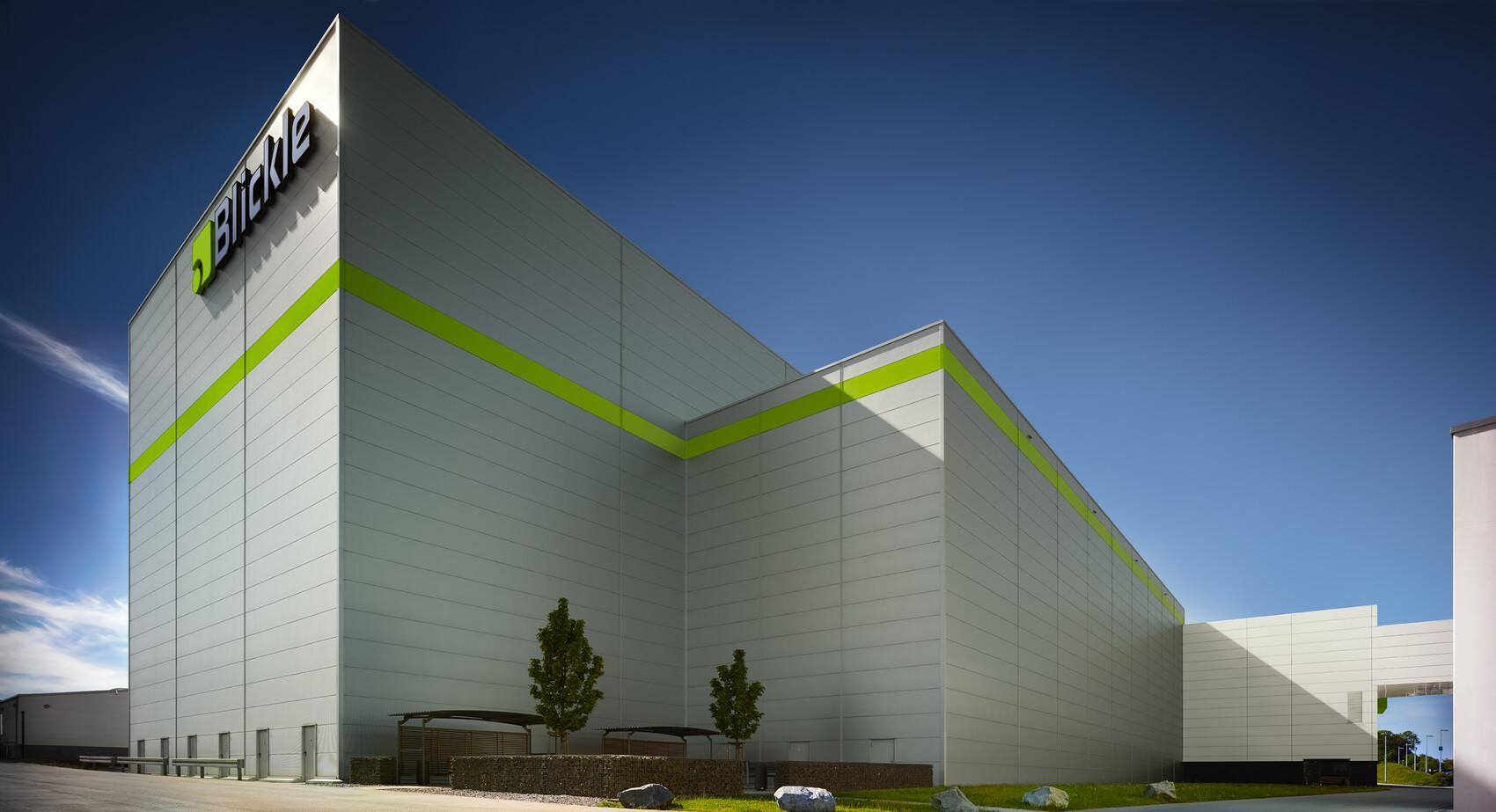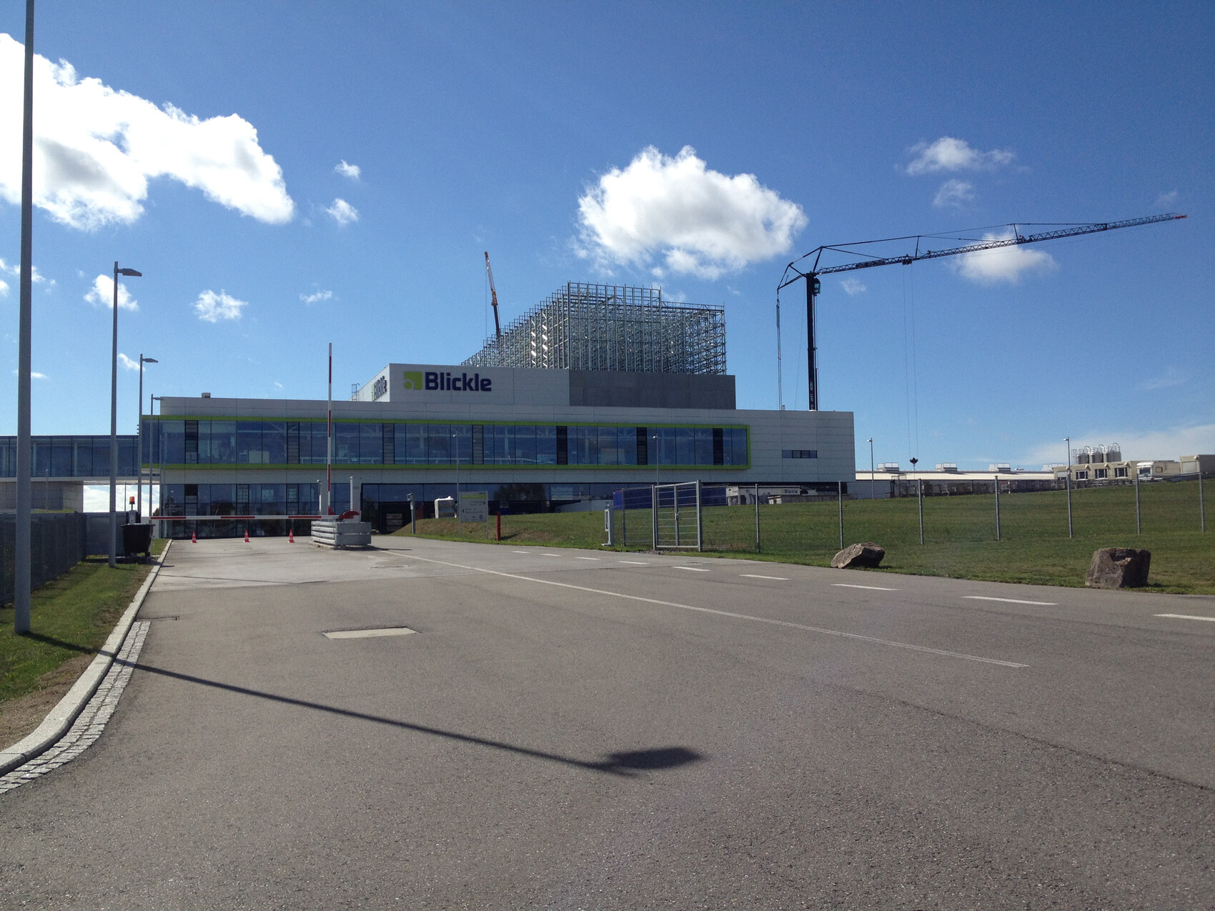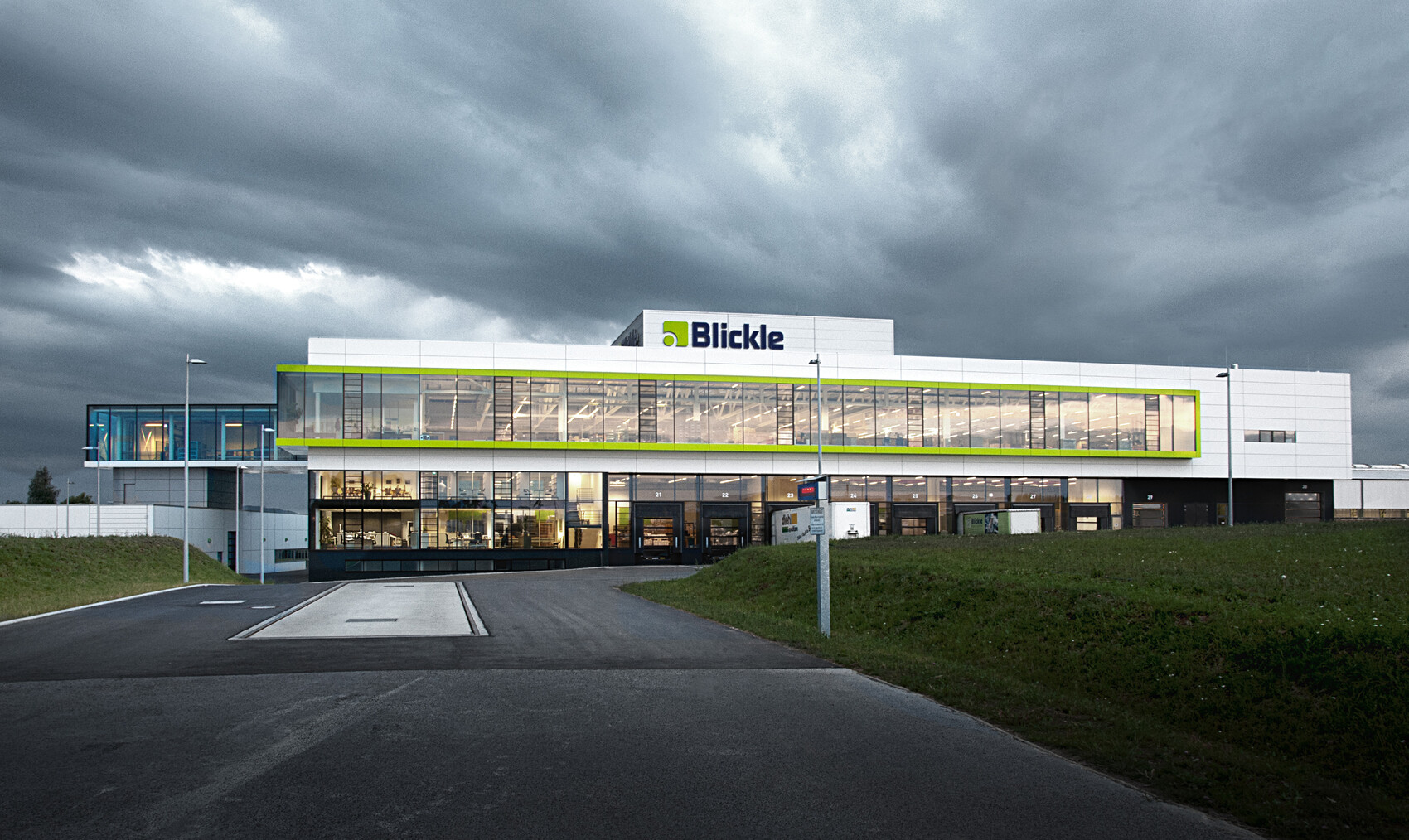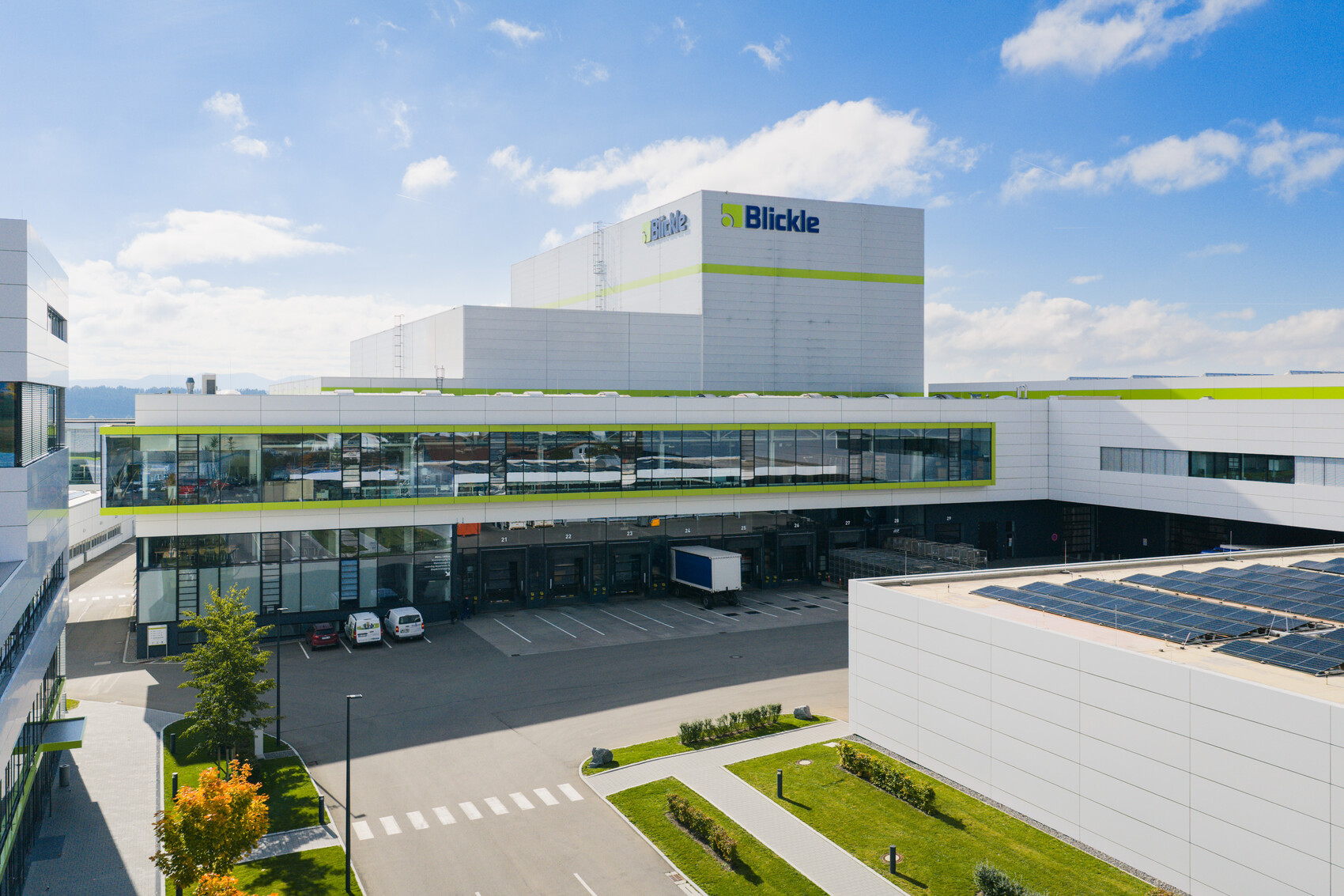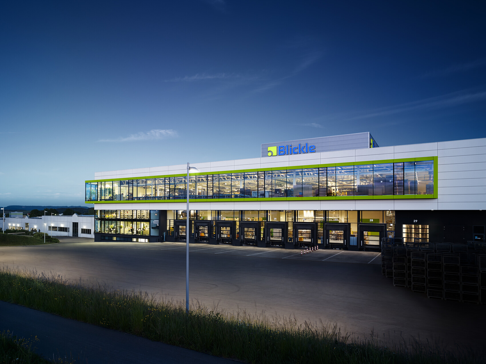 Den Anfang der baulichen Entwicklung bei Blickle machte das Logistikzentrum. Mit zwei Hochregallagern, einem automatischen Kleinteilelager und großzügig verglasten Versandflächen wurde eine leistungsfähige Basis für die weltweiten Warenströme des Unternehmens geschaffen. Mit Höhen von bis zu 40 Metern setzt der Bau klare funktionale Akzente und fügt sich dennoch selbstverständlich in die Umgebung ein.