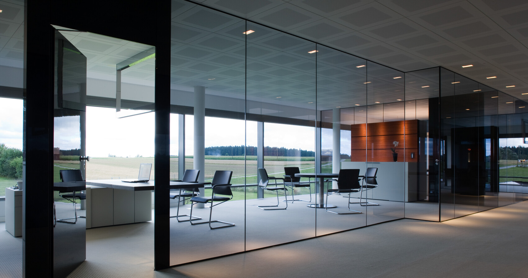 Der Eingangsbereich vermittelt die Offenheit gegenüber neuen Ideen und kundenspezifischen Anforderungen. Herzstück ist ein Glaskubus, der nahezu vollständig aus Glas gefertigt wurde – einschließlich der tragenden Elemente.