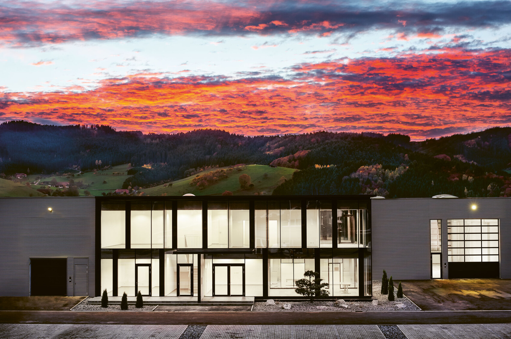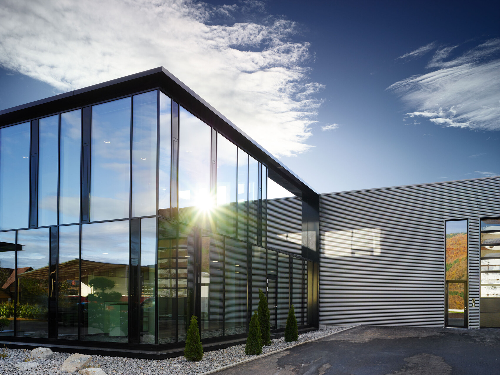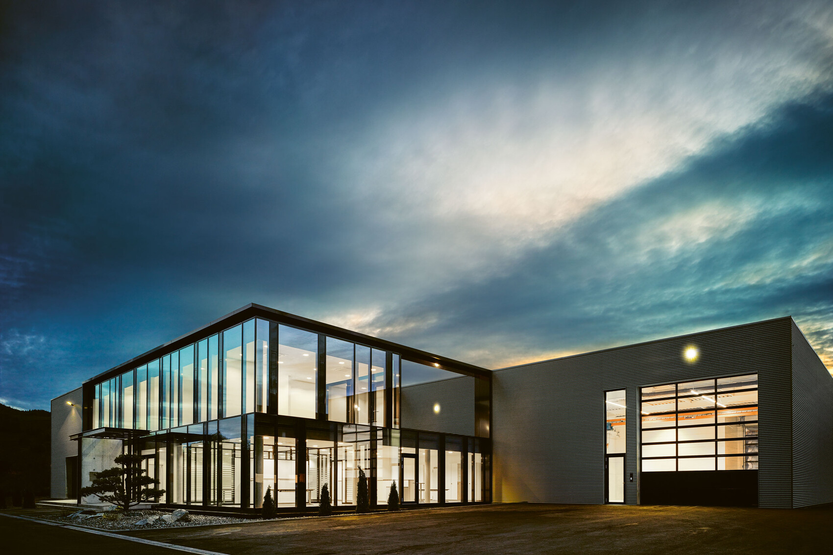 Der Verwaltungskubus wird durch ein umlaufendes, anthrazitfarbenes Band gefasst, das das Gebäudevolumen klar konturiert. Die Fassade aus Sonnenschutzglas ist in einem durchgehenden Raster organisiert, das die Geschossdecke optisch zurücknimmt und erst bei Nacht sichtbar macht. Raumhohe, vertikale Lüftungsflügel bilden ein funktionales Gestaltungselement und ermöglichen natürliche Belüftung ohne zusätzliche Absturzsicherung. Die Produktionshalle dagegen nutzt eine reduziertere, robuste Materialität aus Stahl und Trapezblech; ein durchlaufendes Pfosten-Riegel-Fensterband betont die horizontale Gliederung.