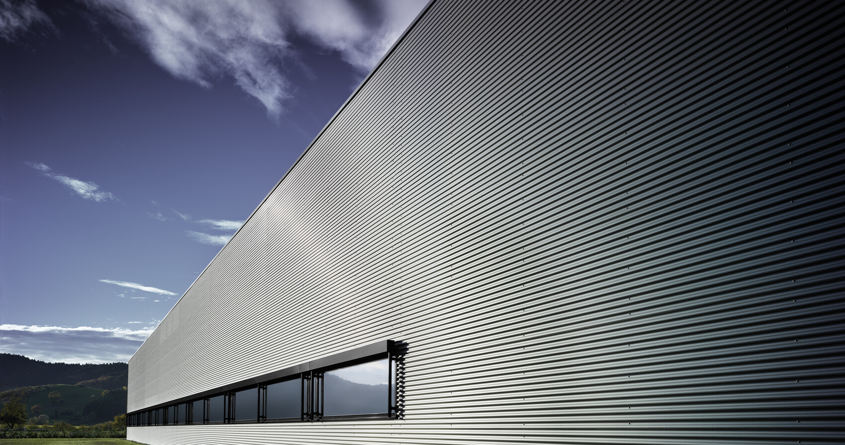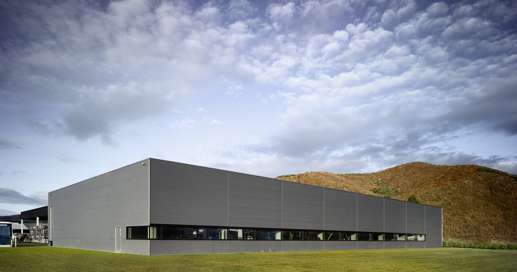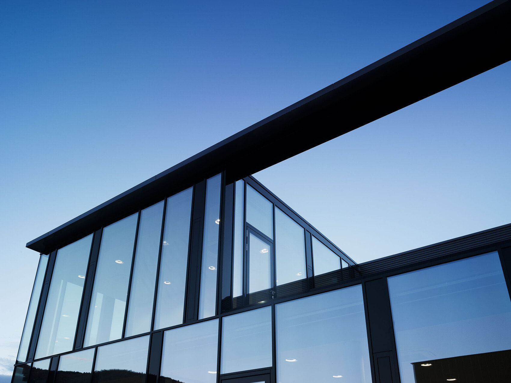 Der Verwaltungskubus wird durch ein umlaufendes, anthrazitfarbenes Band gefasst, das das Gebäudevolumen klar konturiert. Die Fassade aus Sonnenschutzglas ist in einem durchgehenden Raster organisiert, das die Geschossdecke optisch zurücknimmt und erst bei Nacht sichtbar macht. Raumhohe, vertikale Lüftungsflügel bilden ein funktionales Gestaltungselement und ermöglichen natürliche Belüftung ohne zusätzliche Absturzsicherung. Die Produktionshalle dagegen nutzt eine reduziertere, robuste Materialität aus Stahl und Trapezblech; ein durchlaufendes Pfosten-Riegel-Fensterband betont die horizontale Gliederung.