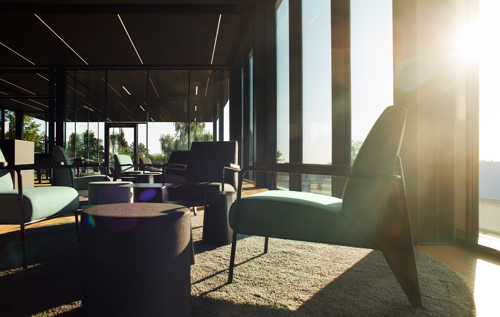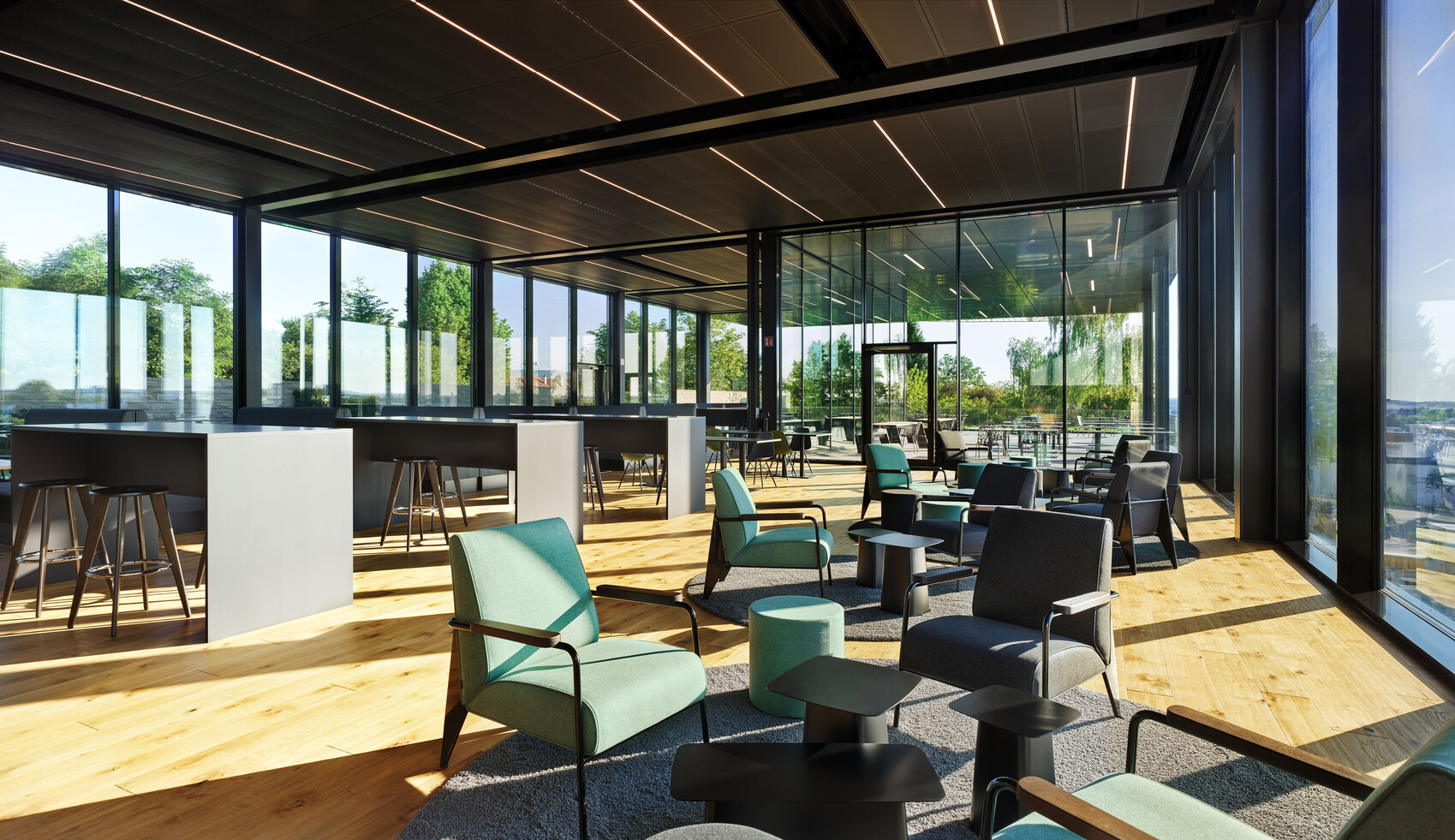 Die weit auskragende Dachkante führt die Aluminiumverbundtafeln fort, schafft eine großzügige Überdachung der Terrasse und bietet geschützte Außenbereiche für Meetings, Pausen und Veranstaltungen. Der Innenraum ist als stützenfreier Pavillon mit bodentiefer Verglasung gestaltet, der Innen- und Außenraum fließend miteinander verbindet und Ausblicke auf den neuen „Viewing Garden“ sowie die Achalm ermöglicht.