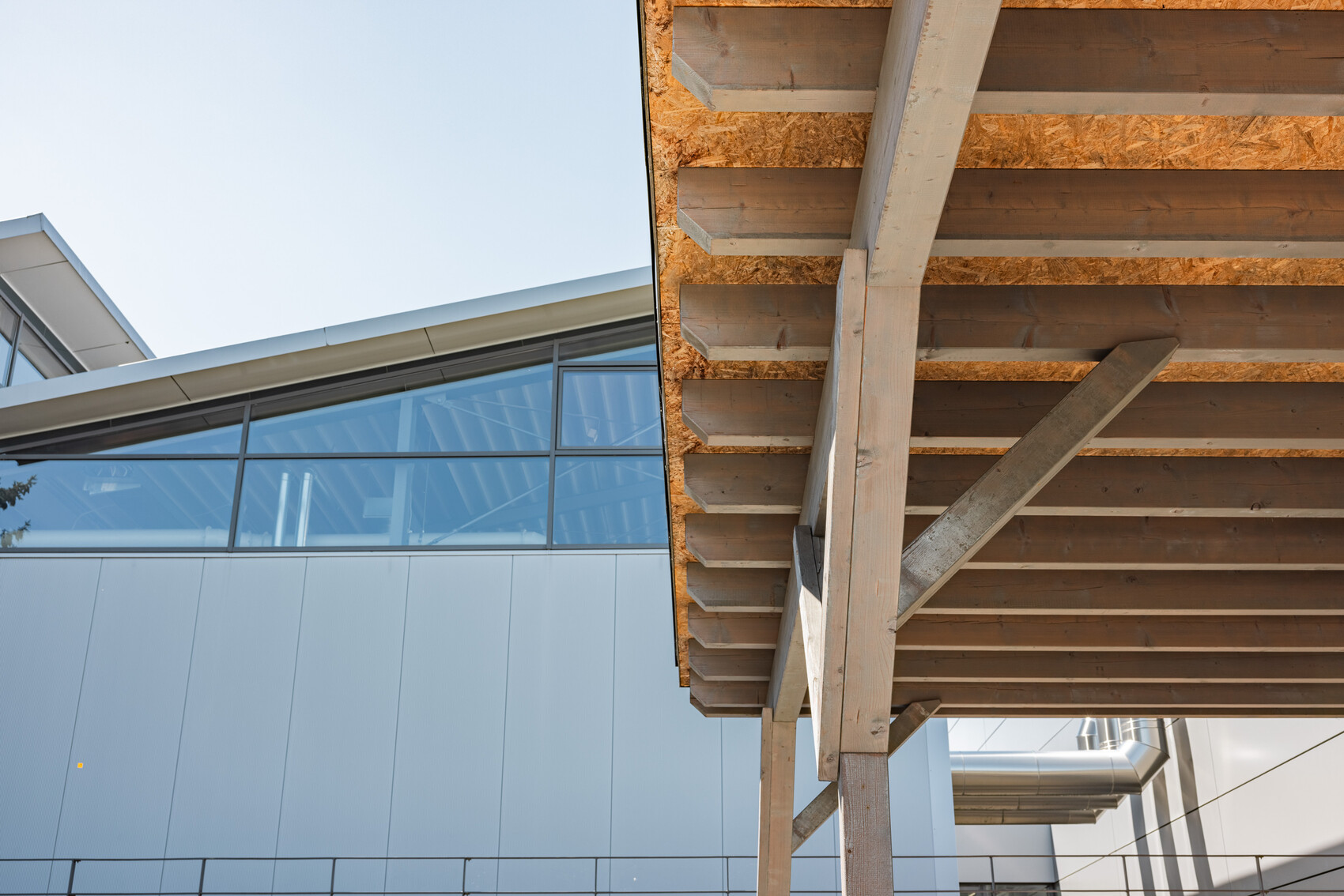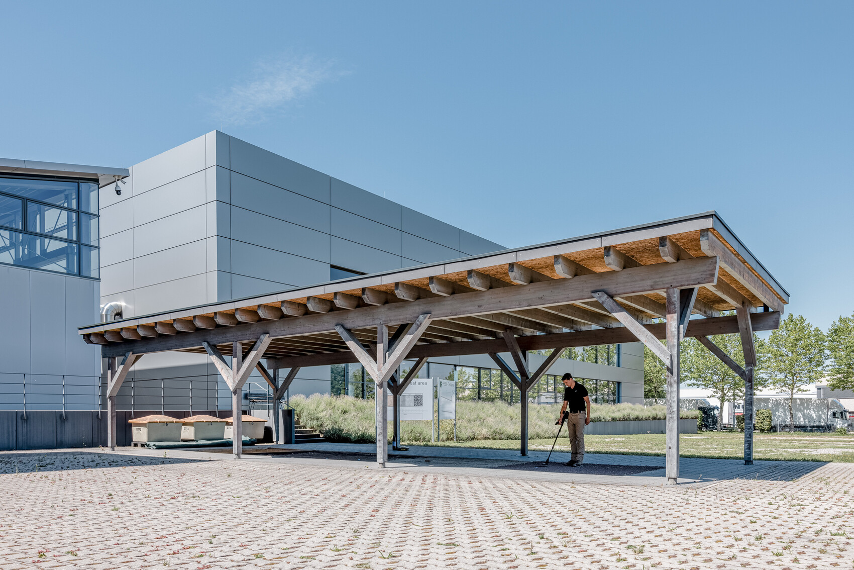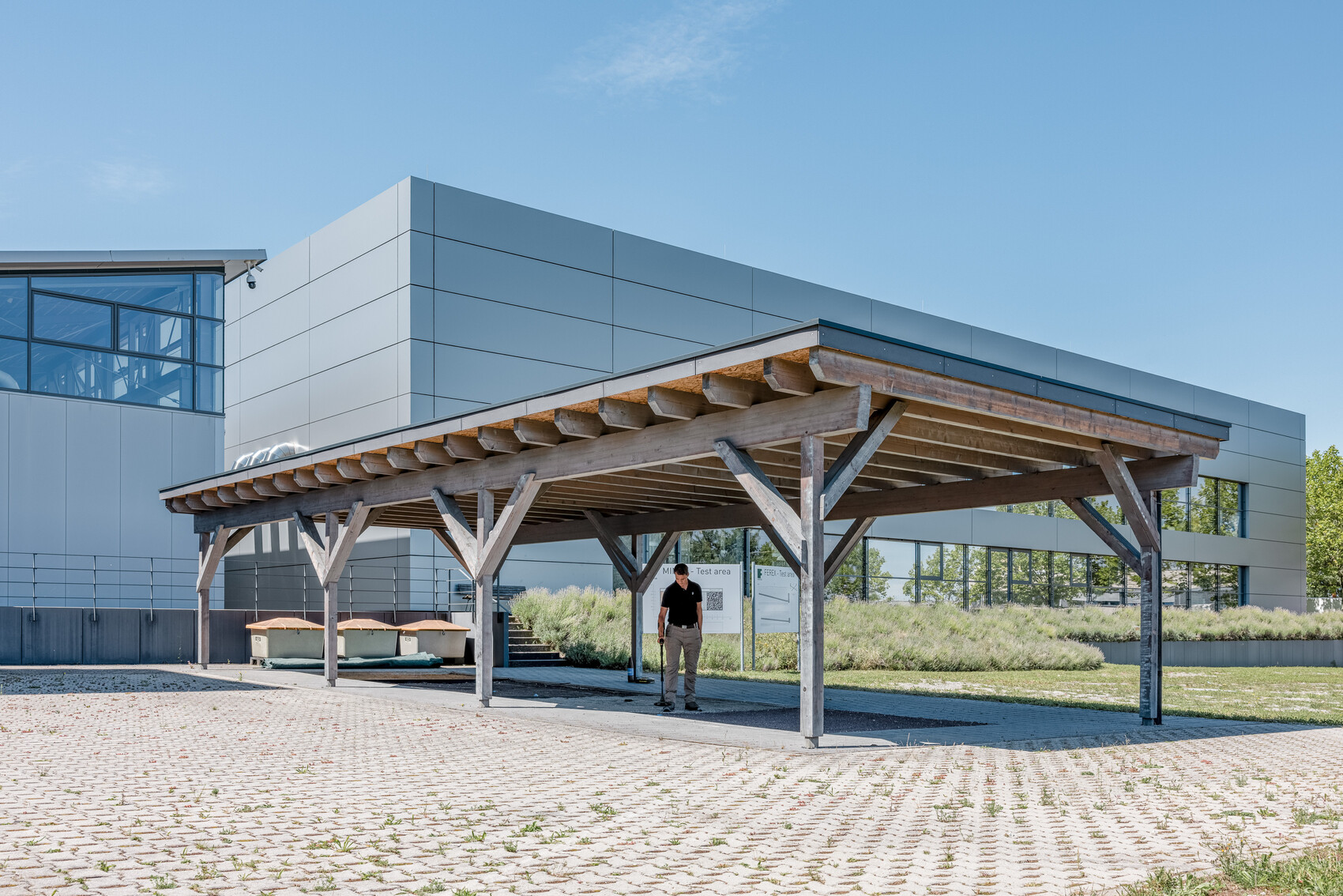 Die Lösung war ein Bauwerk nach archaischen Prinzipien: eine komplett metallfreie Konstruktion, bei der ein Großteil der Komponenten aus Holz besteht, von der Überdachung über alle tragenden Elemente und Verbindungen bis zu den Dübeln. Elemente wie Dachabdeckungen, Regenrinne und Rohr sowie Fallleitung hingegen sind aus Kunststoff.