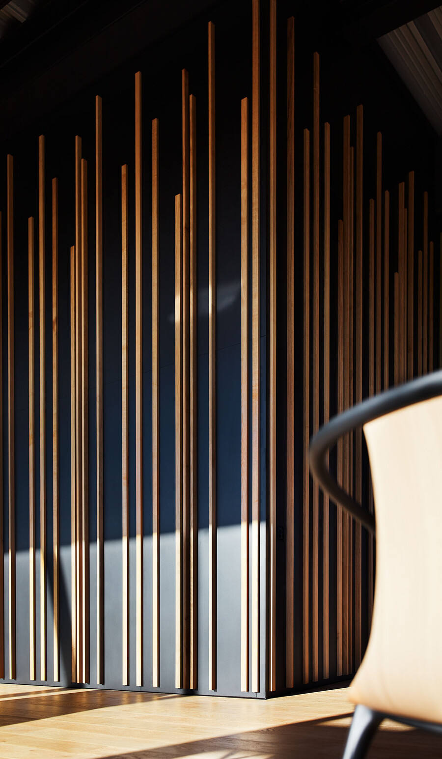 Speziell für Lunor entwickelte, mattschwarze Deckenelemente übernehmen Heizen und Kühlen und wirken gemeinsam mit der Betonkernaktivierung akustisch ausgleichend – für eine angenehme Atmosphäre im Open Space. Eine raumhohe Rauchschutzwand trennt Büro und Produktion vom Lager und Versand, ohne zusätzliche Verkehrsflächen. Lager, Logistik und Büro sind gestalterisch einheitlich ausgeführt, Erweiterungen von Produktion und Büroflächen sind vorbereitet und ermöglichen Wachstum mit minimalem Eingriff.