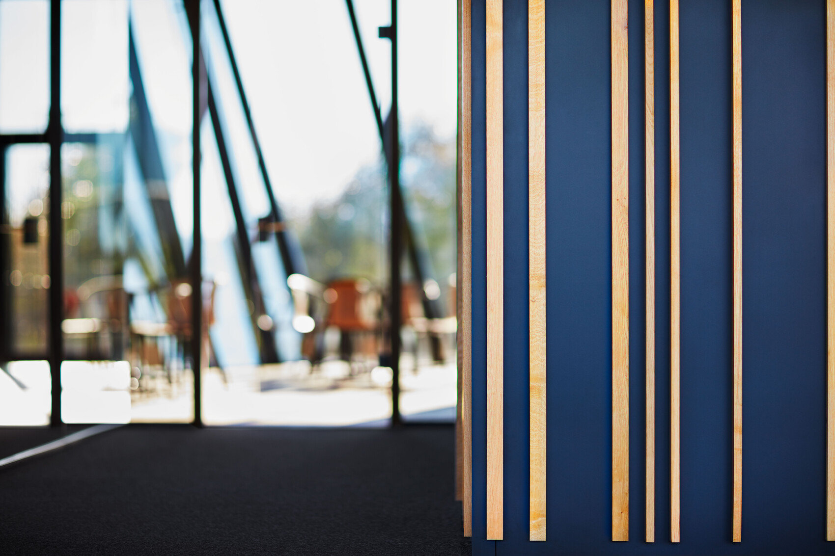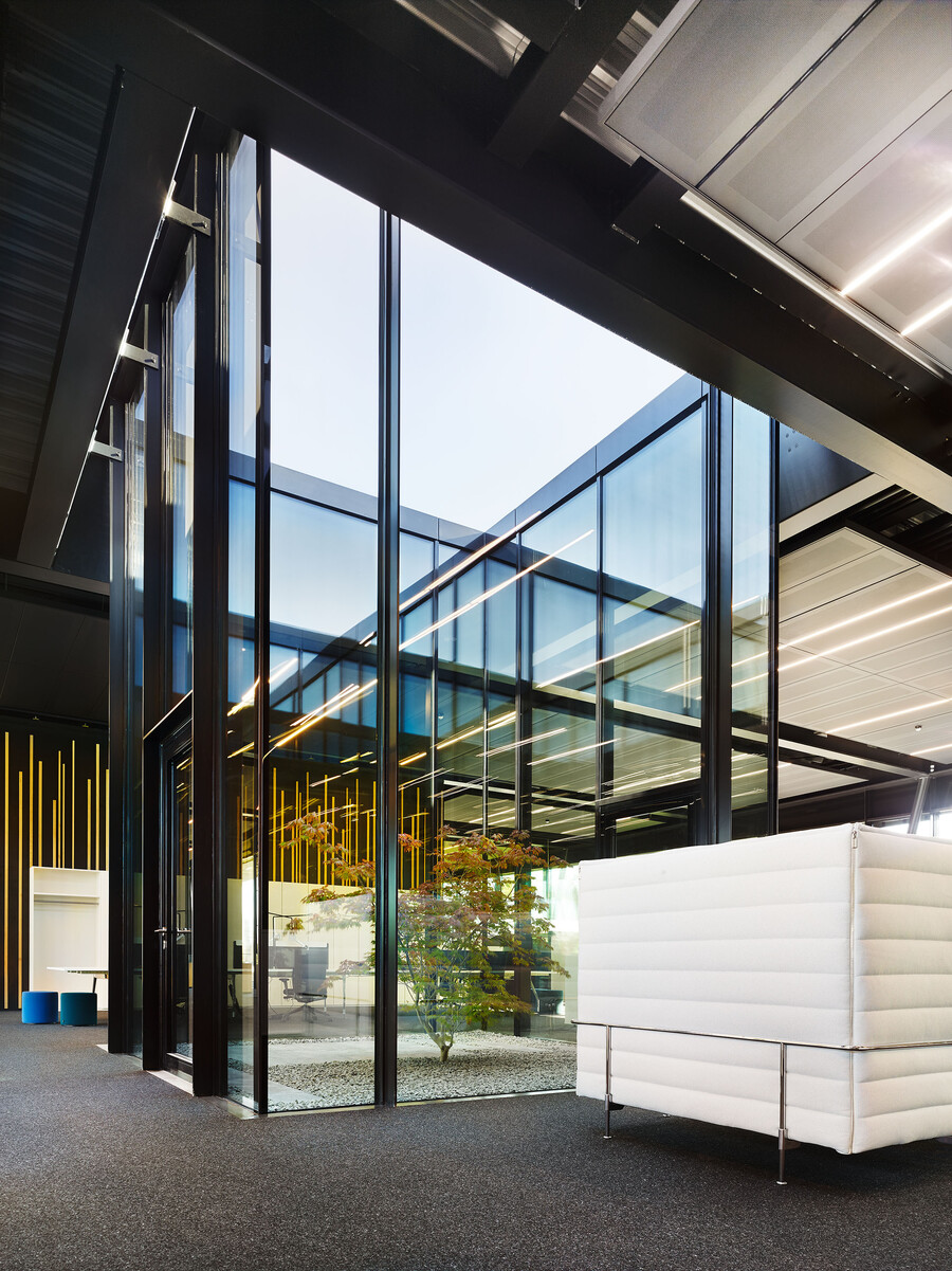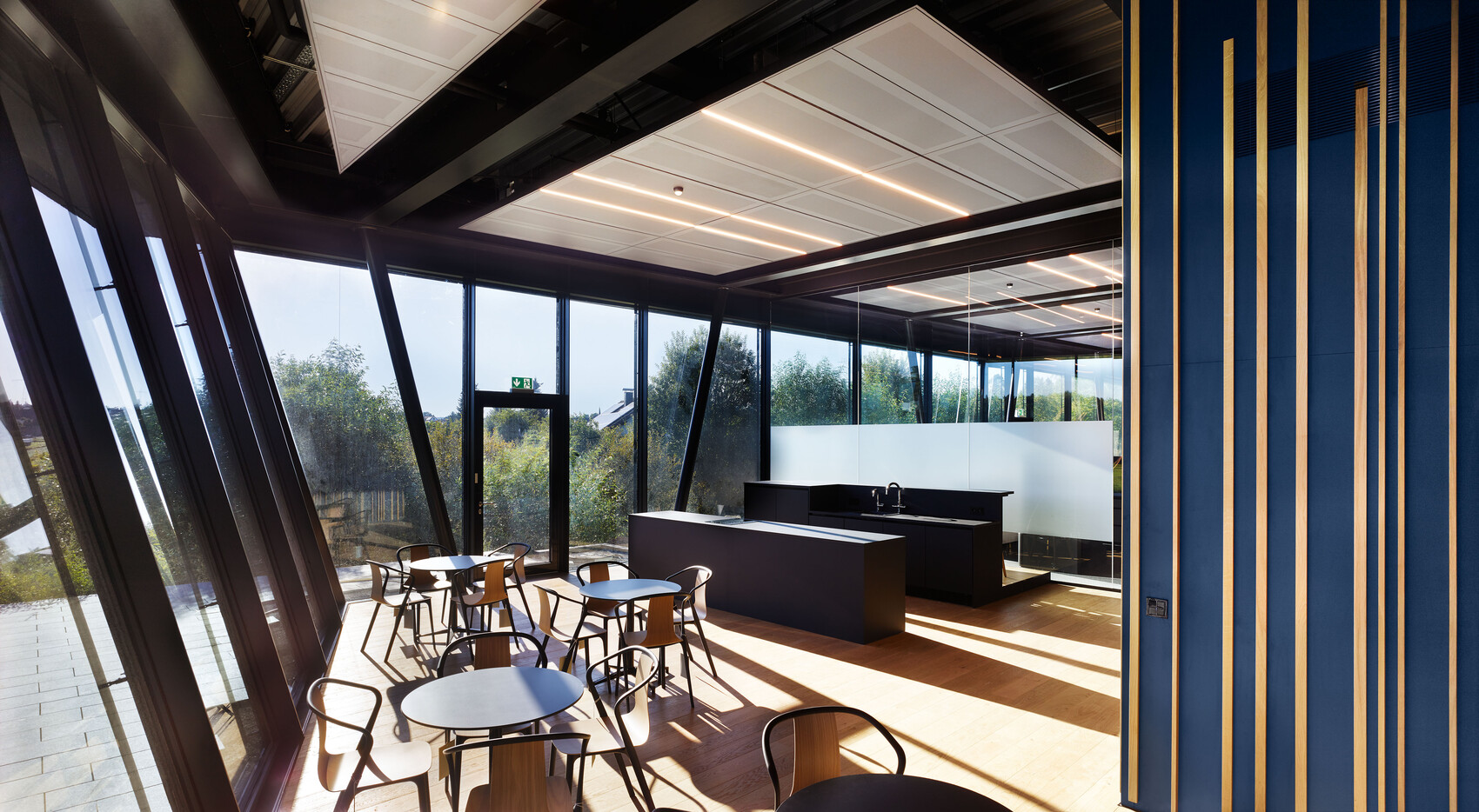 Produktion und Montage sind direkt in den Büroteil integriert – ohne Lärm- oder Schmutzbelastung. Ein zentral positionierter Kubus bündelt sämtliche technischen Versorgungssysteme sowie die Sanitärbereiche und trennt die Büroflächen von Besprechungsräumen und Kantine, die sich zum Naturschutzgebiet orientieren. Dort wurde eine über 4,20 Meter hohe, raumhohe Verglasung ohne zusätzliche Versteifung realisiert und setzt ein klares Zeichen für Transparenz.