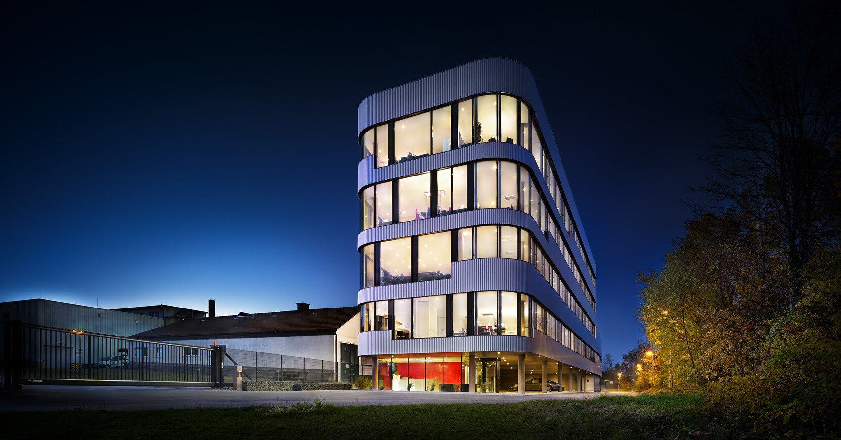 Die Fassade zeigt eine horizontale Bänderung der Brüstungen, die das Volumen gliedert und flexible Grundrisse im Inneren unterstützt. Die Gestaltung der Fassadenelemente folgt einer zeitlosen, funktional begründeten Formensprache. Standardisierte Bauprofile und ausgewogene Proportionen sichern eine wirtschaftliche Umsetzung, ohne die gestalterische Präzision zu beeinträchtigen. Insgesamt entsteht ein Gebäude, das Modernität, Solidität und die technische Ausrichtung des Unternehmens gleichermaßen transportiert.