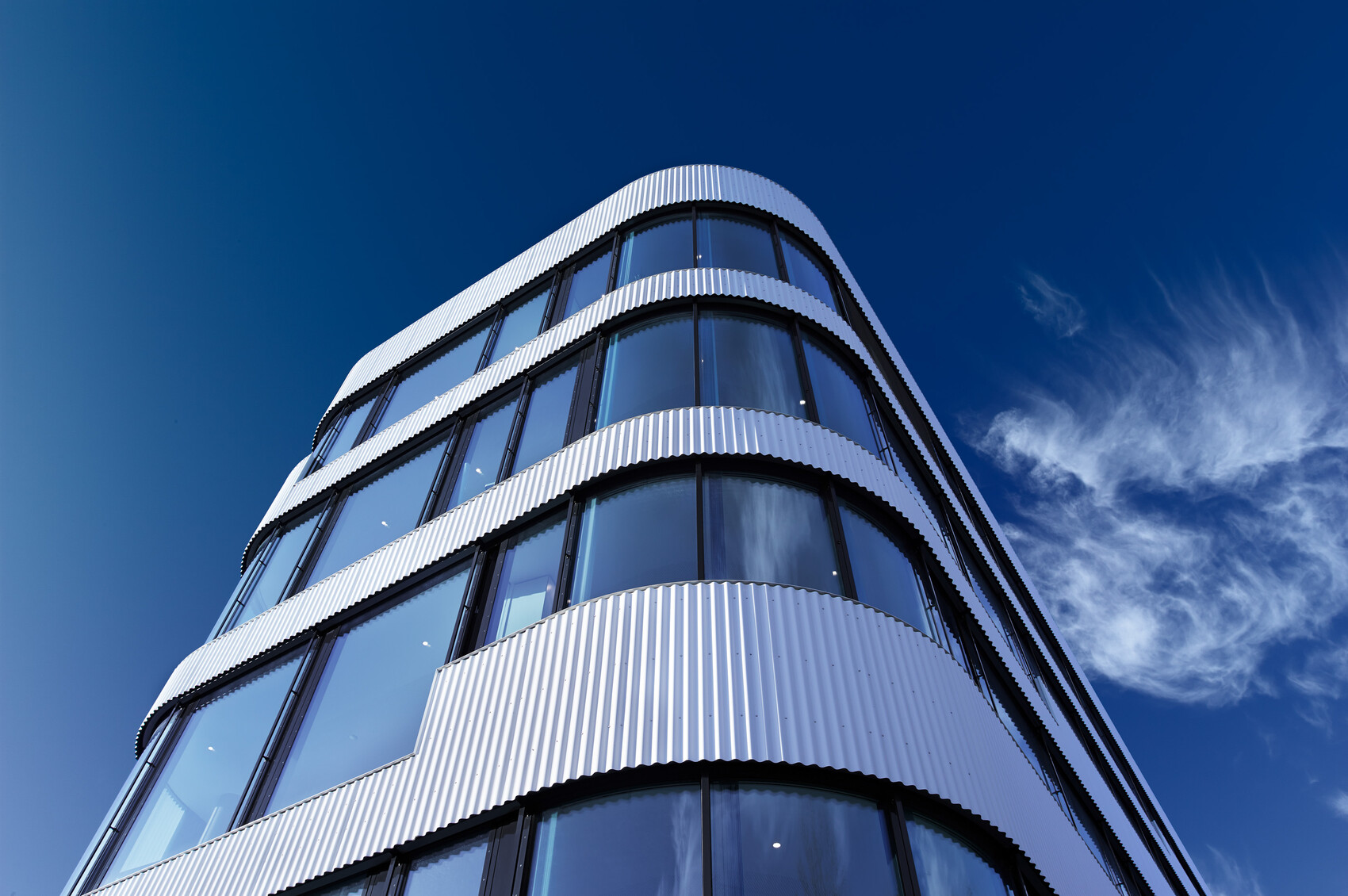 Der Neubau folgt dem Leitmotiv „industriell, funktionell, wirtschaftlich“. Ein zurückgesetztes Sockelgeschoss bildet die Basis, auf der ein Punkthaus über eine umlaufende Fuge scheinbar schwebt. Die bewusst gerundeten Gebäudekanten mildern die räumliche Enge des Grundstücks und referenzieren zugleich die Zylindertypologien von Tanks und Lagerbehältern der Mineralölbranche. Die Formgebung erzeugt eine ruhige, kompakte Figur und schafft eine klare Ablesbarkeit der Funktionsbereiche.