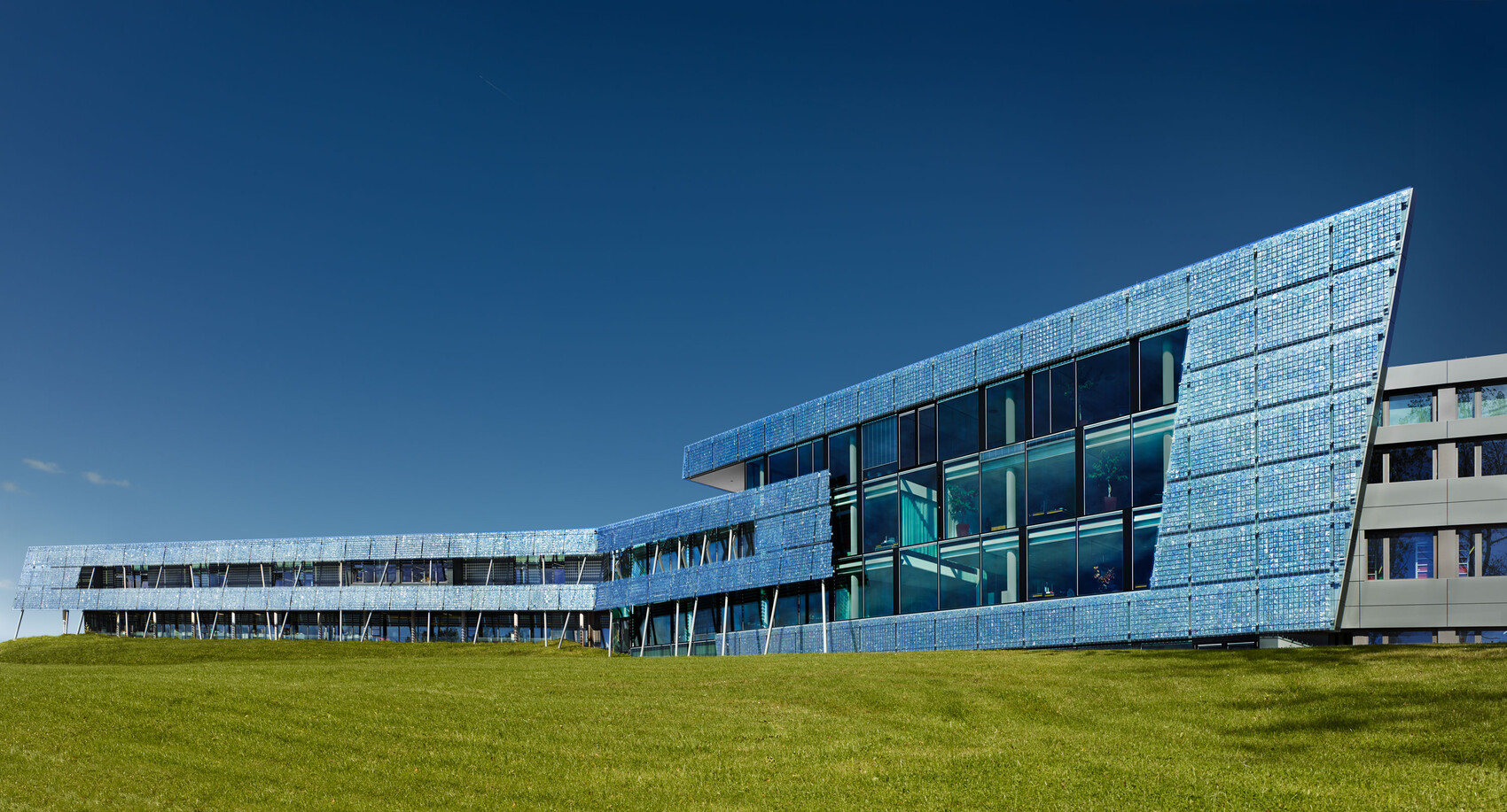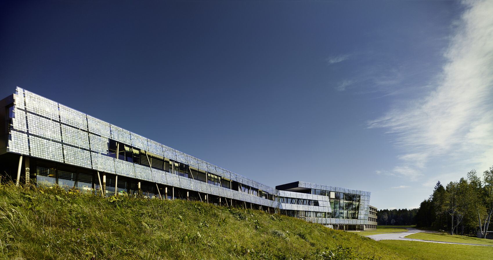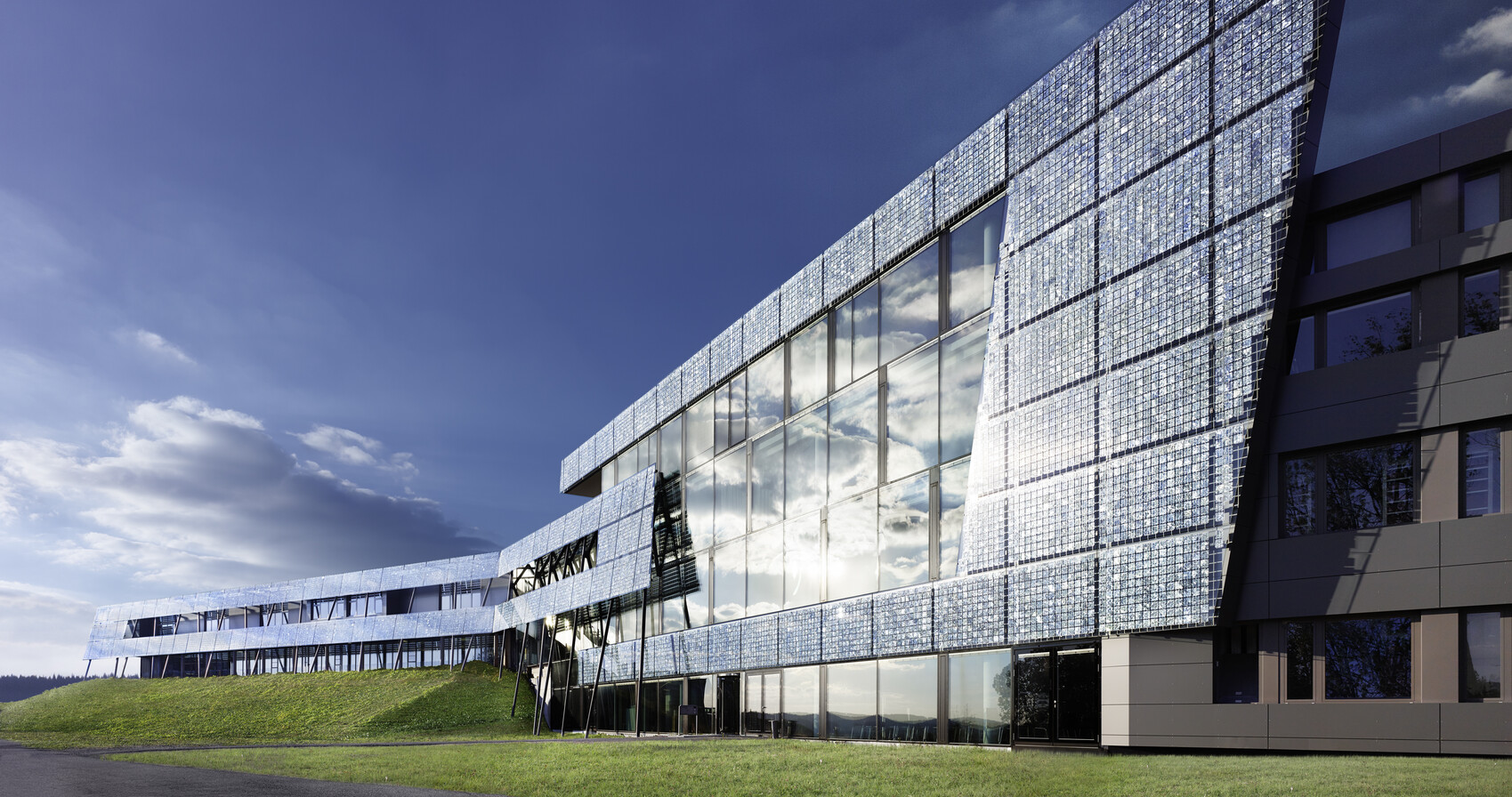 In Gütenbach im Schwarzwald entstand 2013 das neue Headquarter mit einer 120m langen Photovoltaik-Fassade.