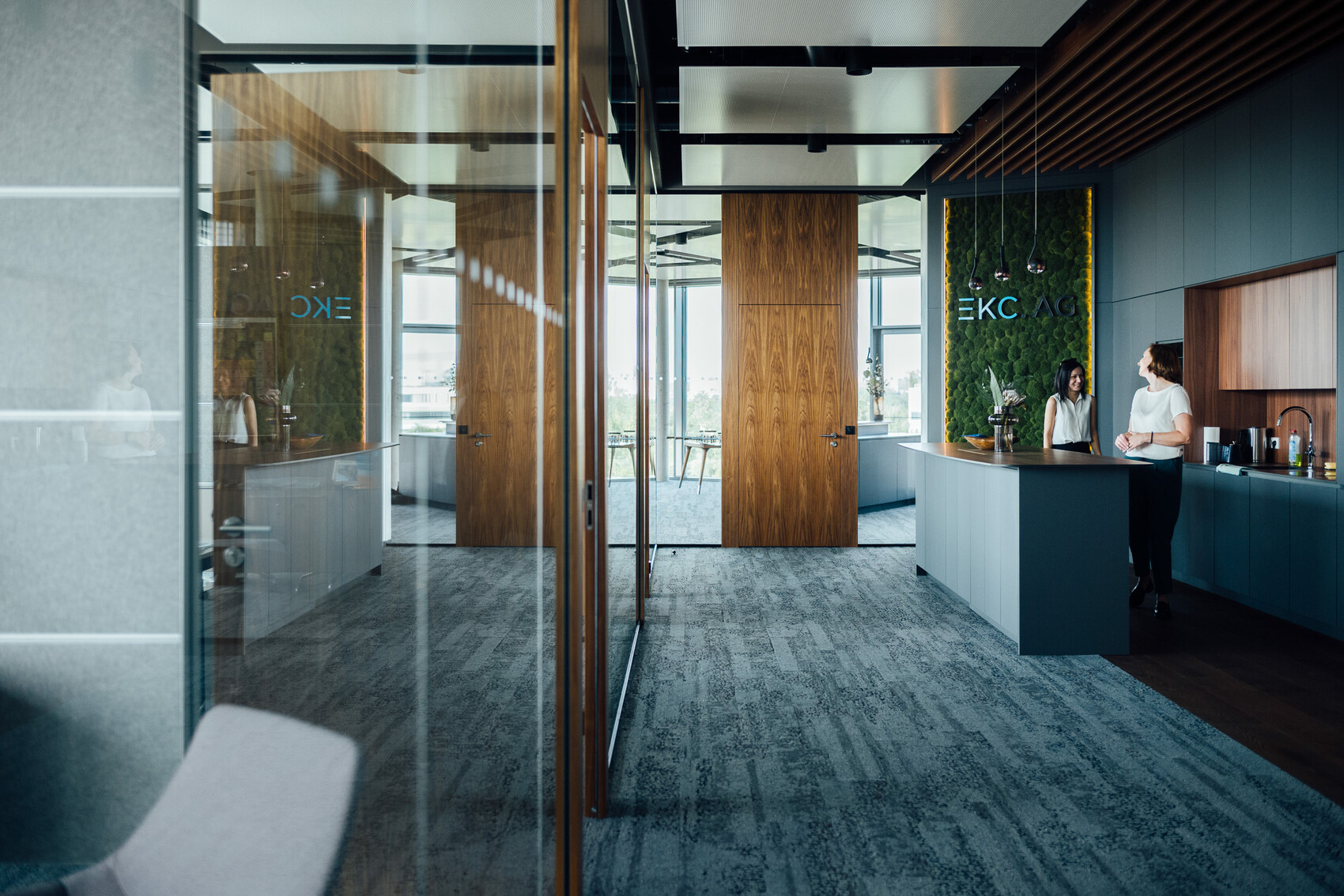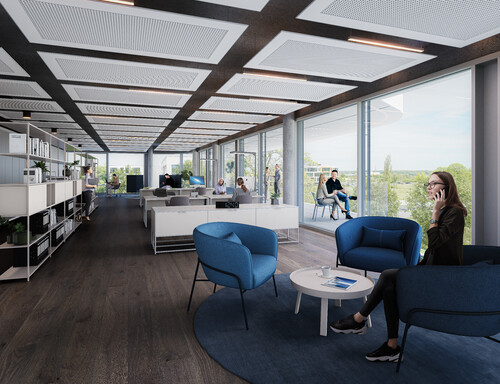 Das Gebäude ist durch Nahwärme versorgt, in KfW-Standard 55 gebaut und mit Photovoltaik-Anlagen auf dem Dach ausgestattet, die 10 E-Ladesäulen versorgen. Die Dachfläche ist zudem begrünt. Temperierbare Deckensegel sorgen für ein behagliches Heizen und Kühlen. Die Terrassen für die Mitarbeiter sind wohltuende Rückzugsorte.