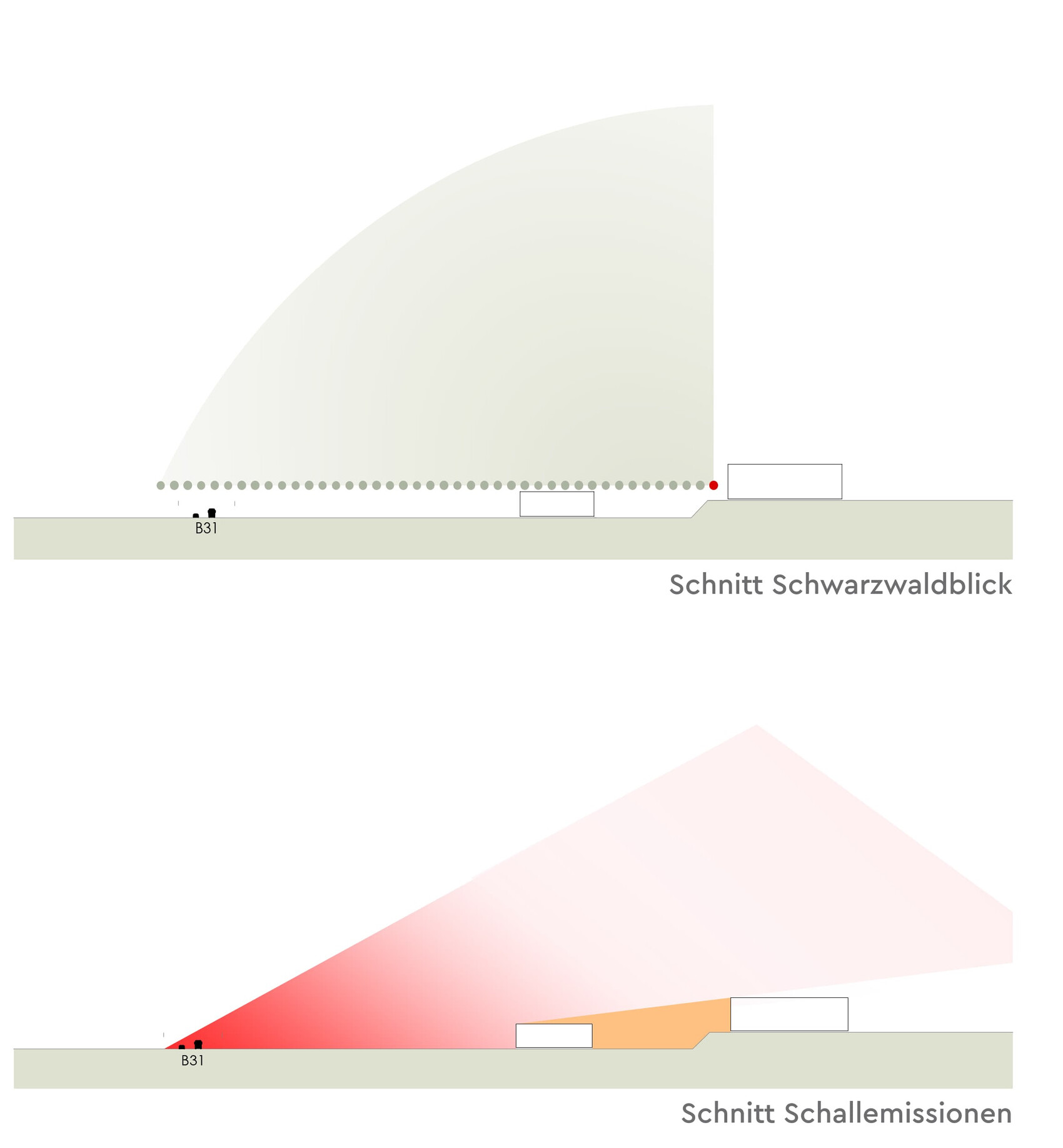 Das Hufeisenförmige Volumen schafft einen ruhigen geschützten Innenhof. Durch die flache Kubatur versperrt die Form aber trotzdem nicht den Blick auf die höher gelegenen Schwarzwaldberge.