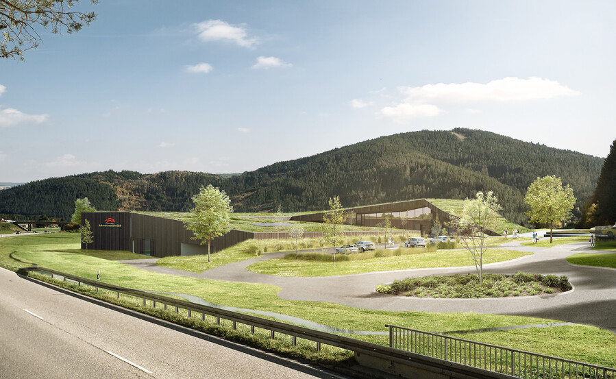 Das neue Besucherzentrum auf dem Ruhestein liegt an Deutschlands ältester Panoramastraße und steht im Kontext von Natur, Wald, Wasser, und Wind. Archaisch und prägnant - ein einfacher Holzkeil, ergänzt durch einen leichten aufgesetzten Glaskörper, durch dessen Transparenz die Lastabtragung über urwüchsiges, kraftvolles Stammholz erkennbar ist. Natürliche Stämme, die durch ihre Neigung das Gebäude statisch aussteifen. Regionale Materialien wie sägeraues, gehobeltes, geschältes Holz oder heimischer Schwarzwald-Granit prägen den Charakter des Gebäudes.