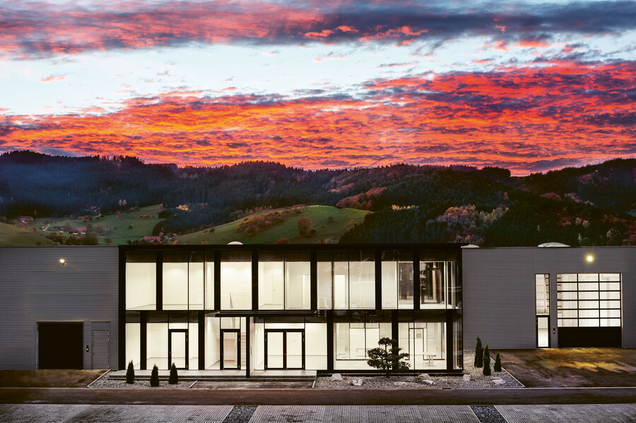 Am neuen Standort vereint das Gebäude Verwaltung, Konfektion, Digitaldruck und Technik unter einem Dach. Die stützenfreien Räume durch große Stahlträger bieten maximale Flexibilität. Natürliche Materialien wie geöltes Eichenparkett schaffen eine warme Arbeitsatmosphäre. Die Stahlbetonbauweise mit Betonkernaktivierung sorgt für effiziente Energiespeicherung und -nutzung.