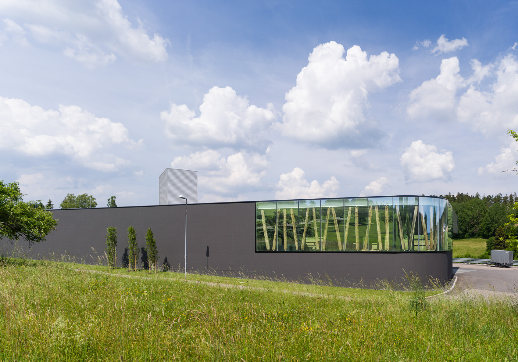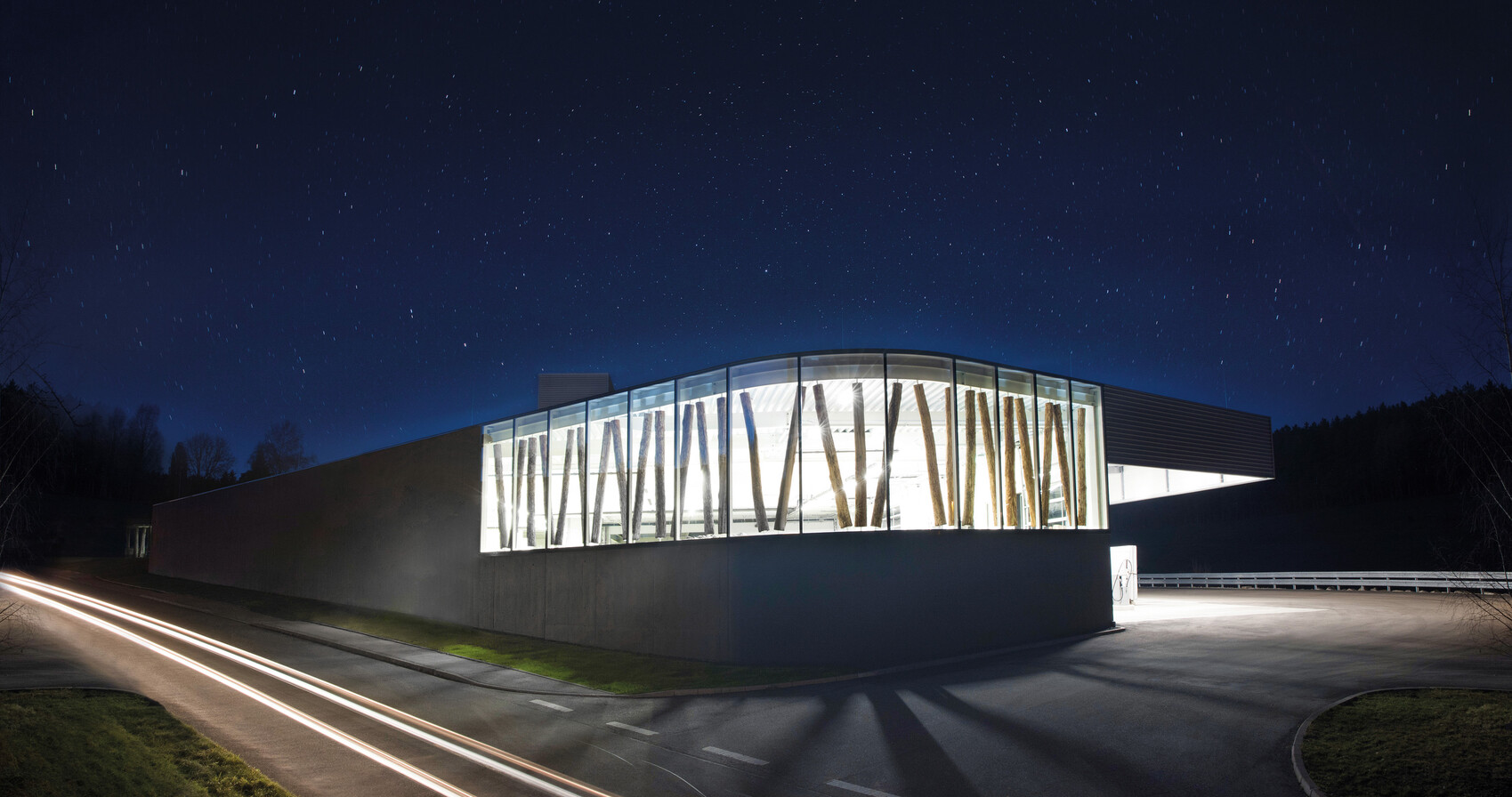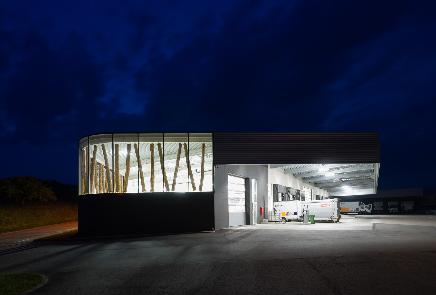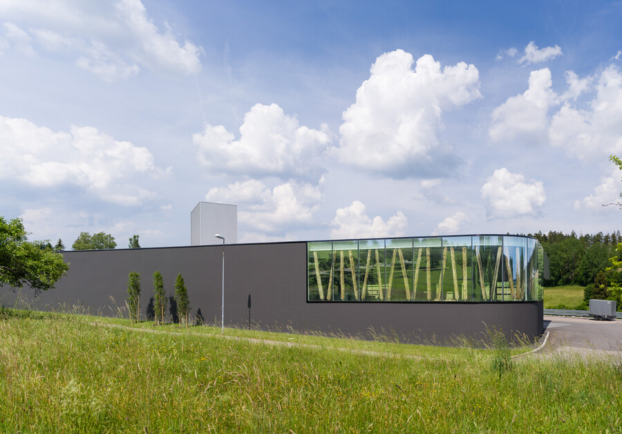 Der Lagerneubau fügt sich perfekt in die Betriebsabläufe ein und setzt die architektonische Corporate Identity des bestehenden Produktionsgebäudes fort. Prägend sind die schräg gestellten, statisch tragenden Eichenstämme hinter einer großflächigen Glasfassade.
