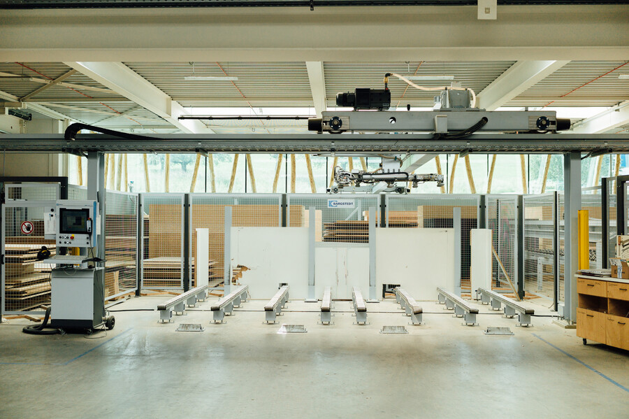 Mit über 20 Meter Spannweiten ermöglicht der Anbau eine flexible Lagerung. Ein vollautomatischer Lagerlift lagert Klein- und Halbfertigteile ein und stellt sie produktionstechnisch bereit – gesteuert per Computerpanel.